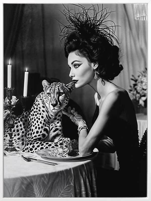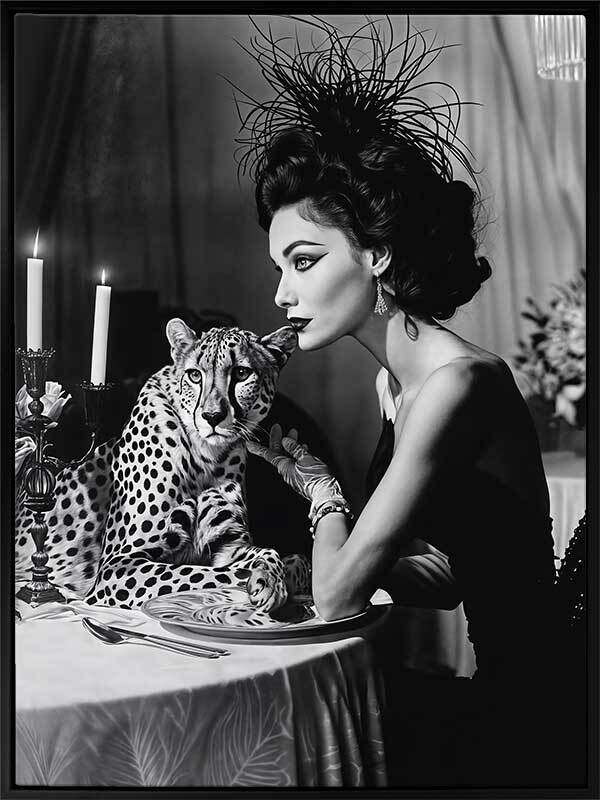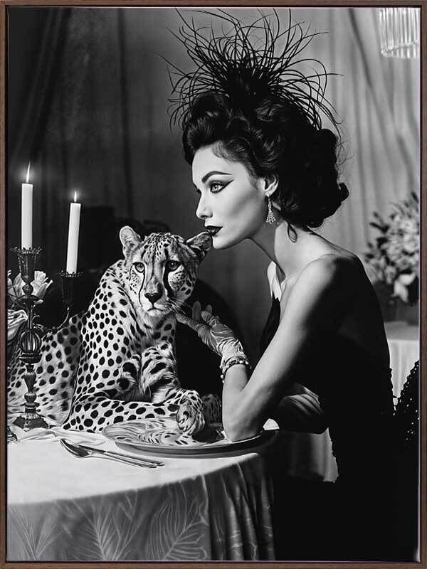 Feline Couture Canvas Art Print - In this captivating black-and-white artwork from interior designer Shaynna Blaze's exclusive designer collection, glamour and intrigue come together in perfect harmony. A woman dressed in a sleek black gown and adorned with a feather hat pets her cheetah dinner companion under the soft candlelight at the dinner table. With a monotone palette, this limited edition art print adds a retro-inspired flair to any space, exuding pure glamour with a cheeky, relaxed edge. This wall art for living rooms and bedrooms channels both elegance and mystery, making it a bold and luxurious addition to any interior design style.