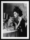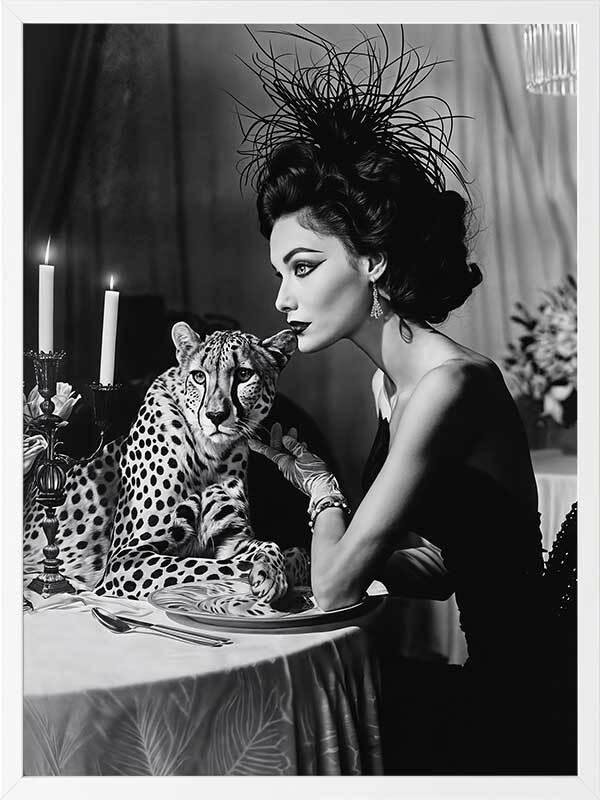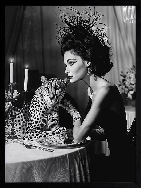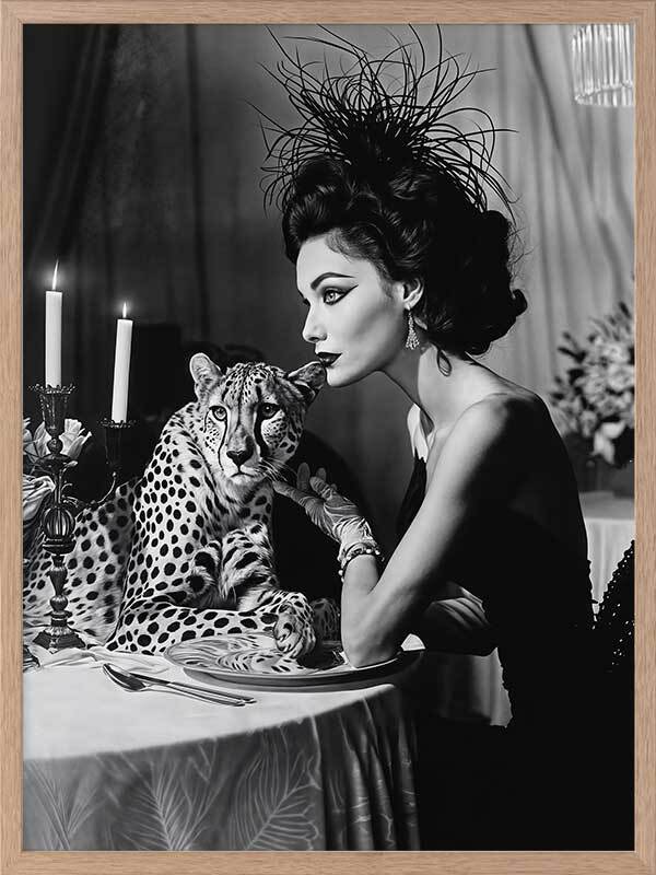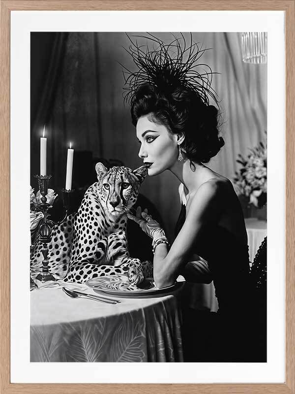Feline Couture Framed Art Print - In this captivating black-and-white artwork from interior designer Shaynna Blaze's exclusive designer collection, glamour and intrigue come together in perfect harmony. A woman dressed in a sleek black gown and adorned with a feather hat pets her cheetah dinner companion under the soft candlelight at the dinner table. With a monotone palette, this limited edition art print adds a retro-inspired flair to any space, exuding pure glamour with a cheeky, relaxed edge. This wall art for living rooms and bedrooms channels both elegance and mystery, making it a bold and luxurious addition to any interior design style.