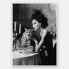 Feline Couture Unframed Art Print - In this captivating black-and-white artwork from interior designer Shaynna Blaze's exclusive designer collection, glamour and intrigue come together in perfect harmony. A woman dressed in a sleek black gown and adorned with a feather hat pets her cheetah dinner companion under the soft candlelight at the dinner table. With a monotone palette, this limited edition art print adds a retro-inspired flair to any space, exuding pure glamour with a cheeky, relaxed edge. This wall art for living rooms and bedrooms channels both elegance and mystery, making it a bold and luxurious addition to any interior design style.