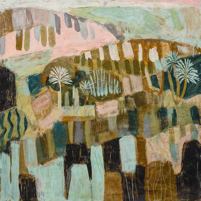 Finding Your Way I Canvas Art Print - This abstract artwork takes your space to new heights with a landscape-inspired design, featuring a medley of muted greens, pastel pinks, and earthy browns. Textured strokes and organic shapes resemble hilly pathways, creating a layered wonderland that enhances any space. Pair with Finding Your Way II and III.