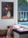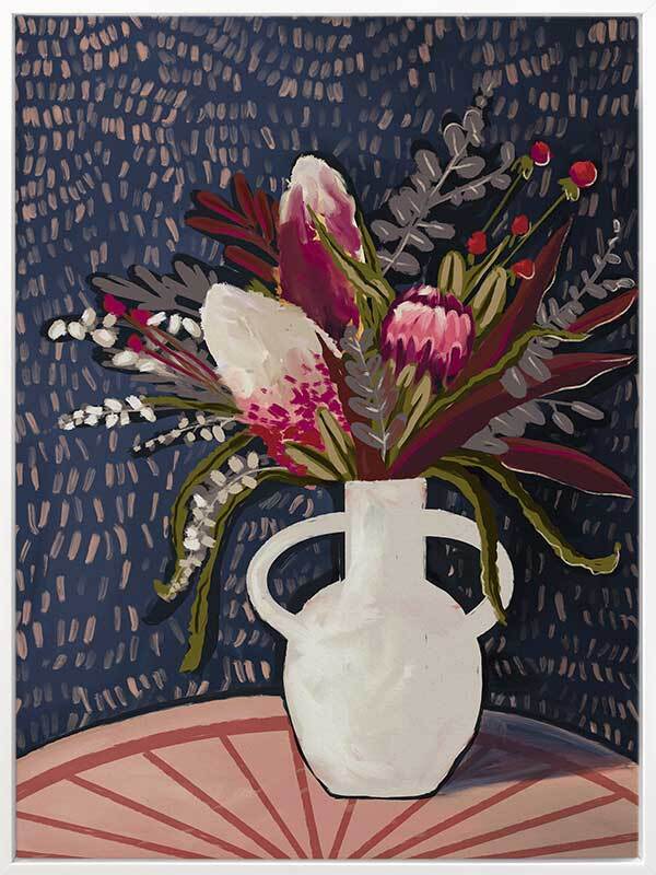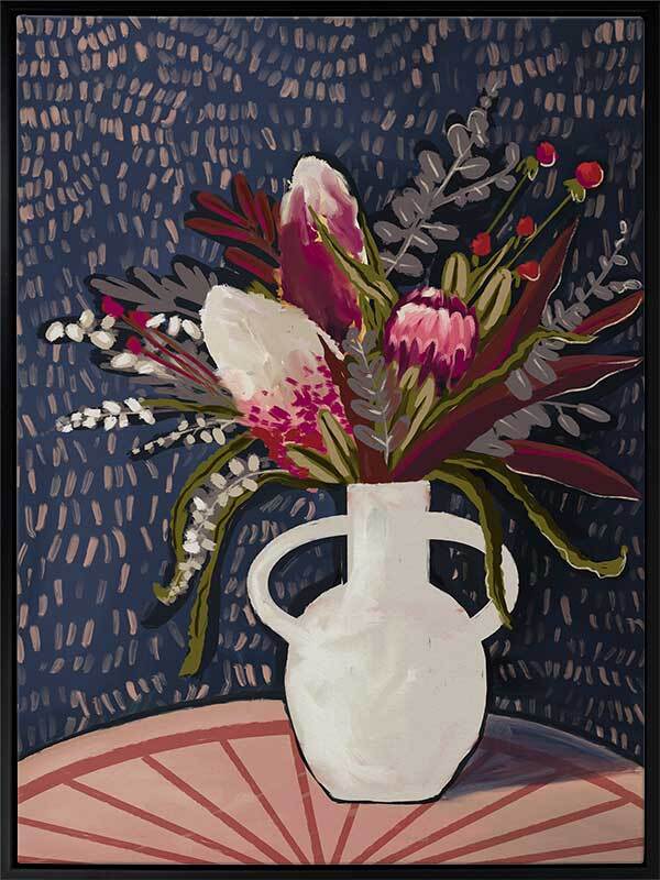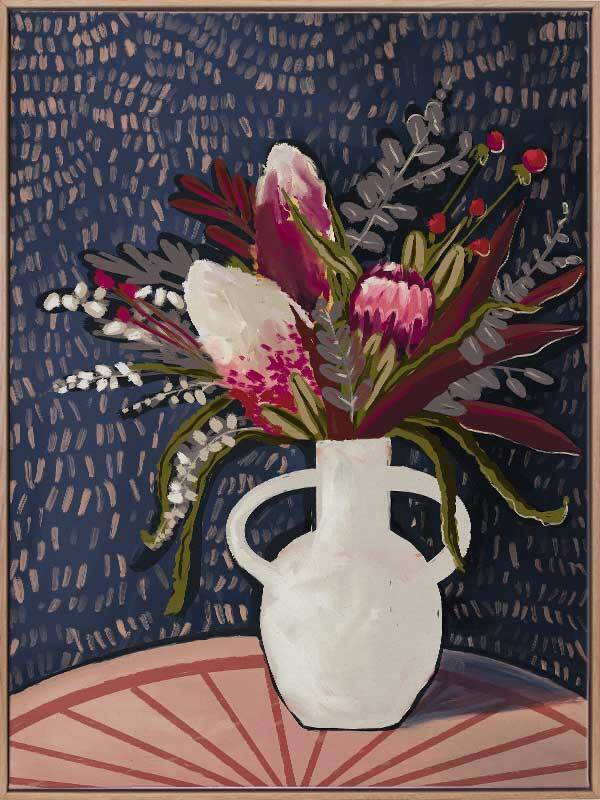 Flora Australis Canvas Art Print - Moody, feminine and romantic, this painterly style still life artwork features a white vase full of a beautiful array of Australian Native flora - including banksia, protea and gum leaves. The deep, rich colour palette focusses heavily on dark, plum, navy and burgundy tones, with dusty pink and grey accents.
