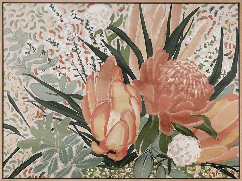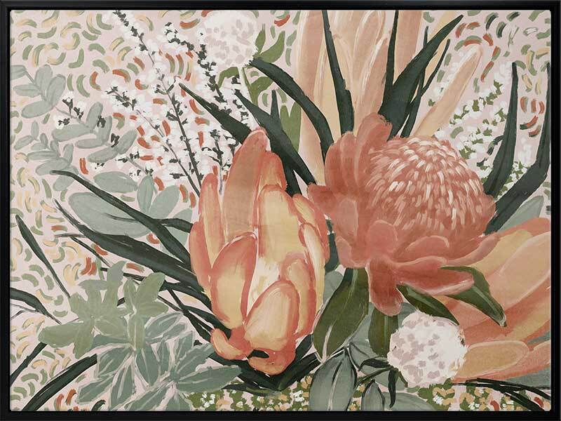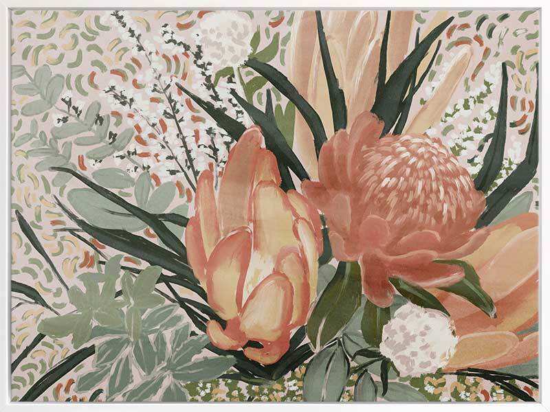 Floral Blush II Canvas Art Print - Make a statement with the bright, playful orange tones used in this Australian floral artwork. As if leaning in the breeze, the use of fresh orange and yellow shades stand out against the dark and light green tones of the eucalyptus leaves.