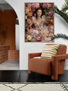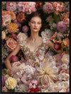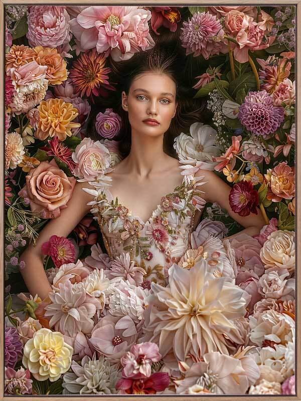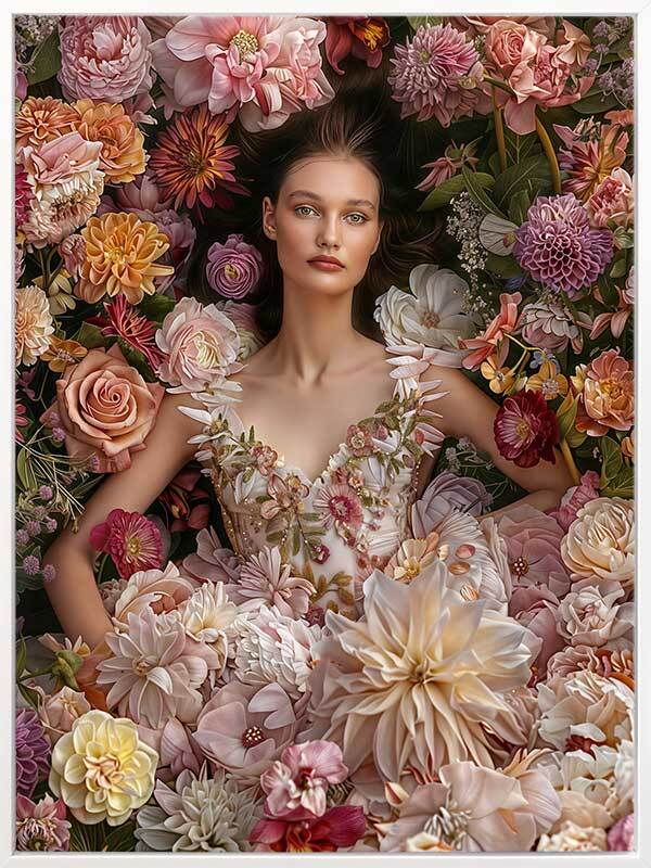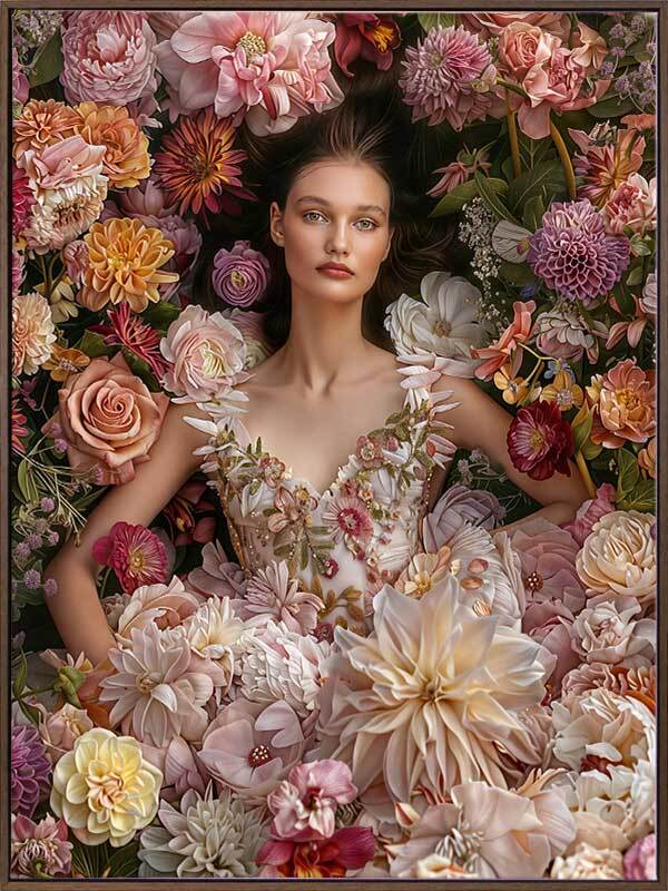 Floral Dreams Canvas Art Print - Immerse your space in the romantic vibes of this breathtaking photographic artwork. Featuring a woman lying amidst a garden bursting with flowers, wearing a stunning floral dress, this wall art exudes a dreamy, whimsical vibe. Soft, dreamy shades of pink and orange stand out against white and green shades, making this the perfect statement piece for any living room or bedroom space.