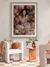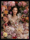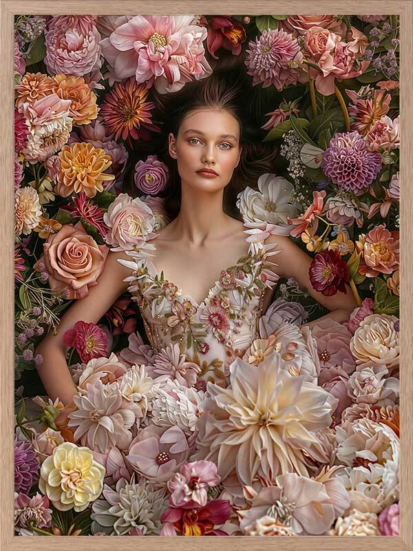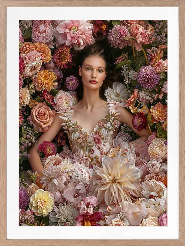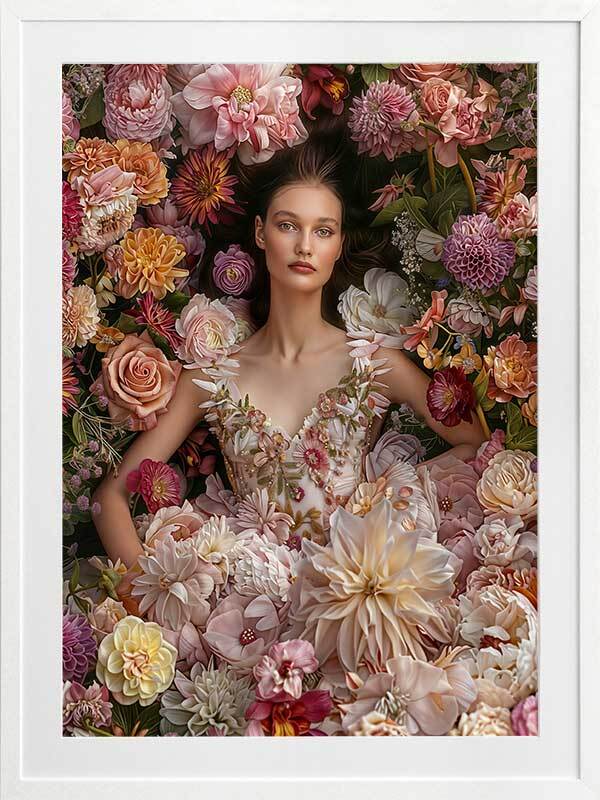 Floral Dreams Framed Art Print - Immerse your space in the romantic vibes of this breathtaking photographic artwork. Featuring a woman lying amidst a garden bursting with flowers, wearing a stunning floral dress, this wall art exudes a dreamy, whimsical vibe. Soft, dreamy shades of pink and orange stand out against white and green shades, making this the perfect statement piece for any living room or bedroom space.