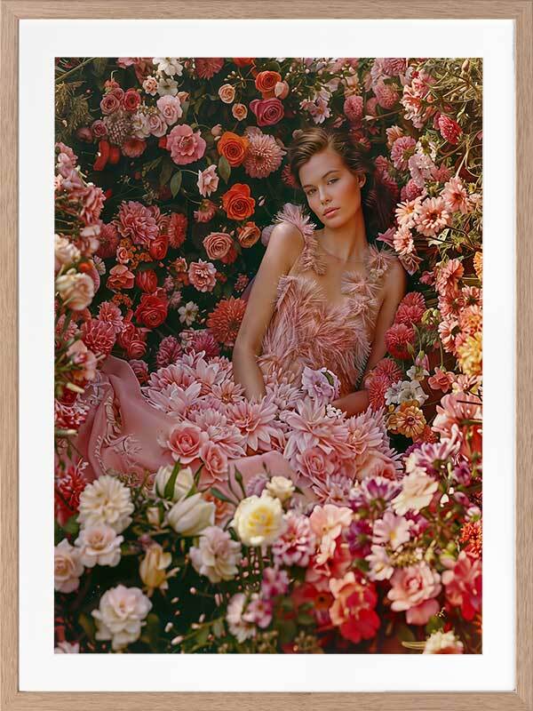 Floral Euphoria Framed Art Print - Immerse your space in the romantic vibes of this breathtaking photographic artwork. Featuring a woman lying amidst a garden bursting with flowers, wearing a stunning floral dress, this wall art exudes a dreamy, whimsical vibe. Soft, dreamy shades of pink and red stand out against white and green shades, making this the perfect statement piece for any living room or bedroom space.
