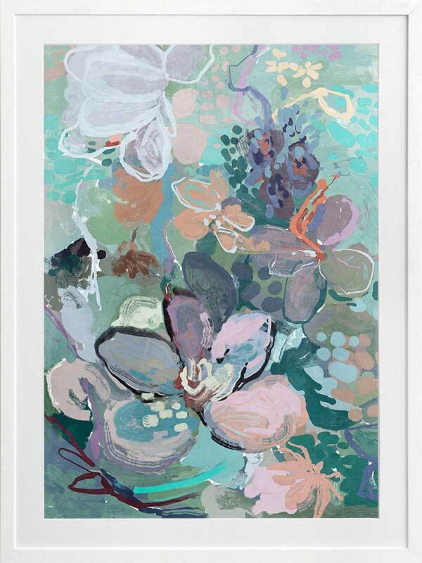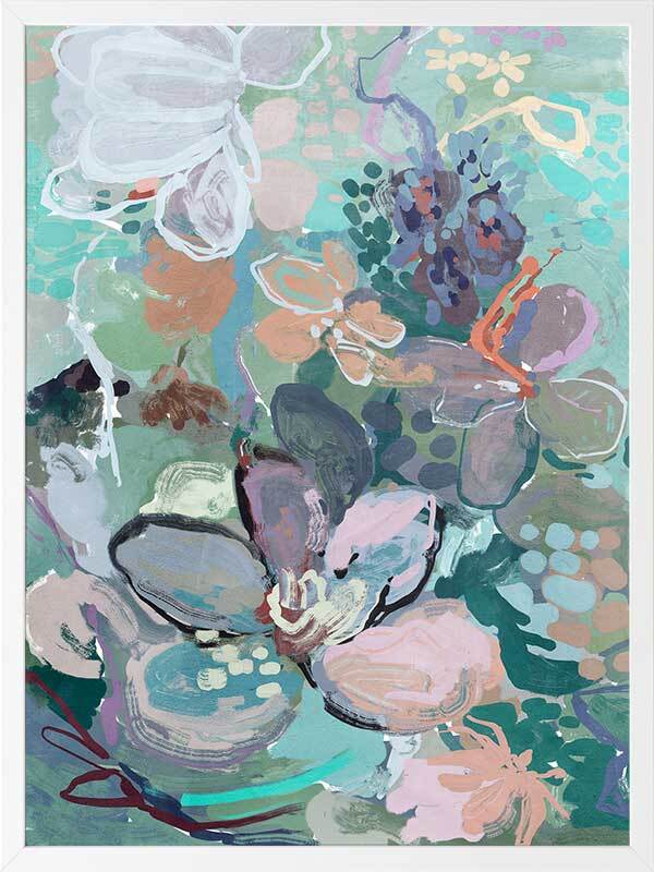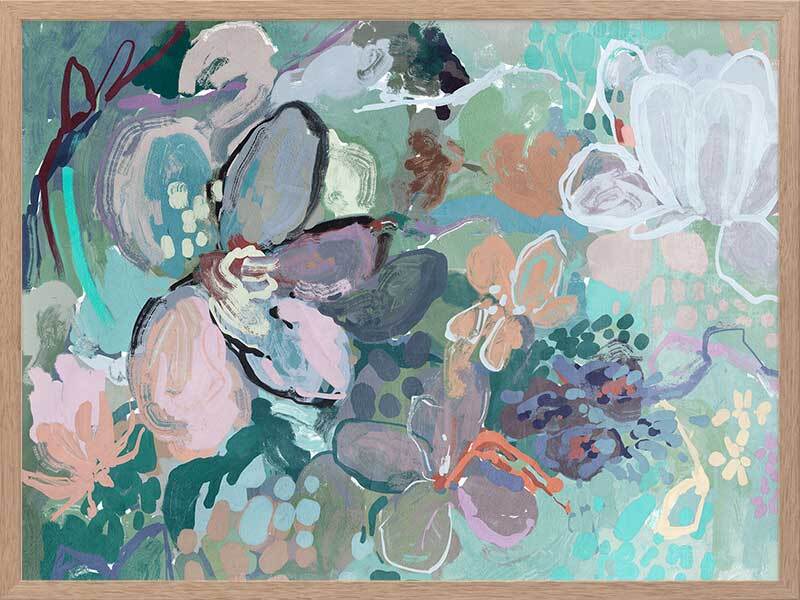 Floral Medley Vibrant Framed Art Print - Inspired by the fluidity of watercolor techniques, the artwork embraces the vision of the artist's brushstrokes and soft blending. The vibrant palette of bright teal, delicate hints of pink, whispers of purple, and subtle touches of orange and beige infuse the piece with a whimsical and playful energy. Allow this enchanting artwork to transport you to a world of beauty and imagination, where the softness of flowers takes center stage and brings joy to your space.