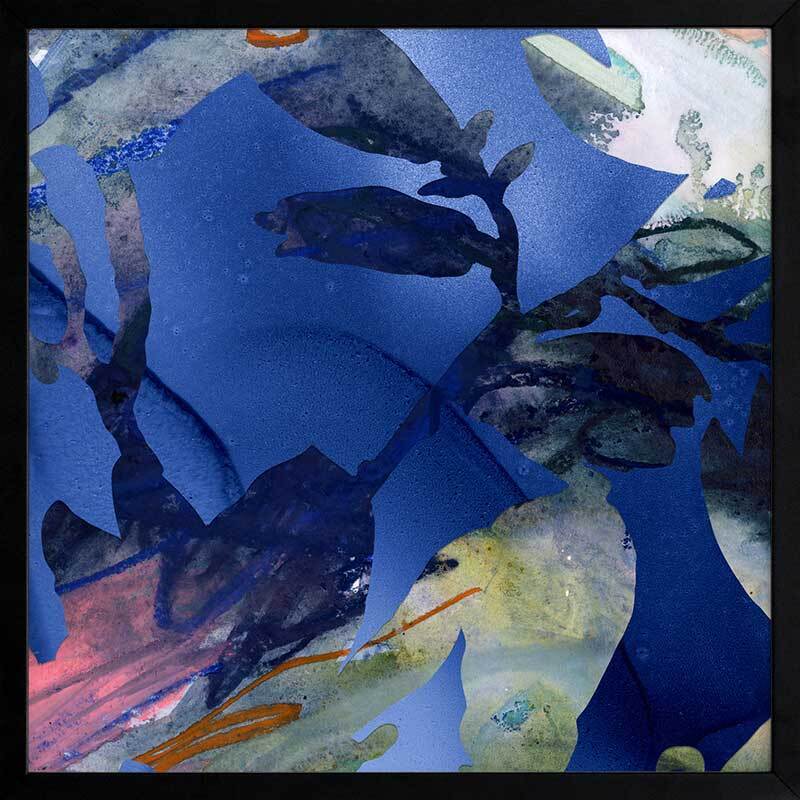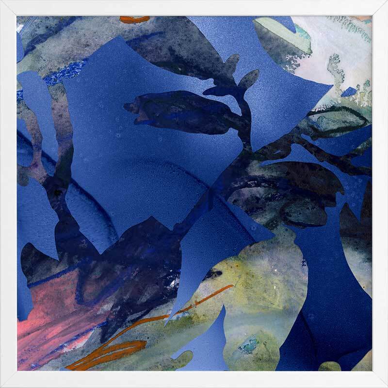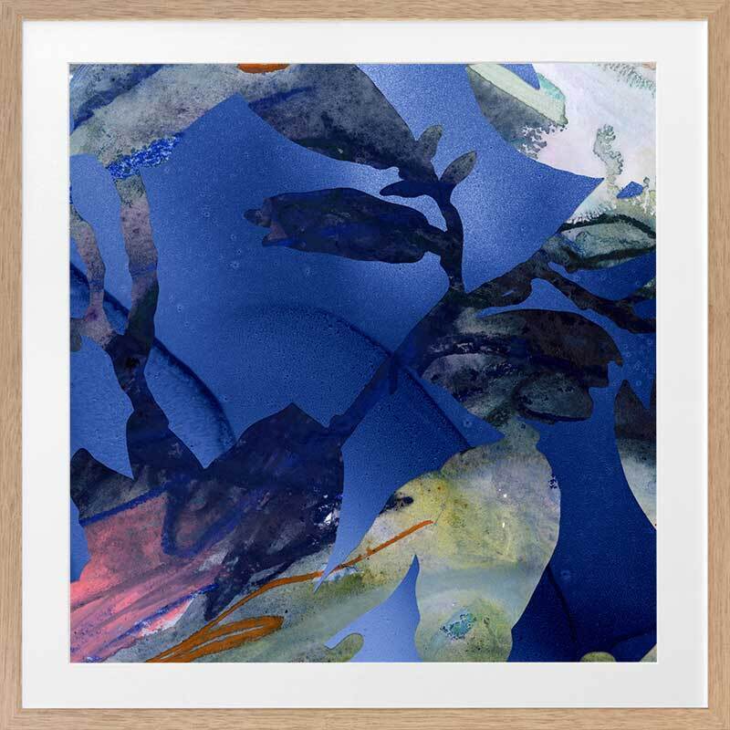 Floralia Framed Print: A vibrant abstract featuring floral cutouts and a bright blue, pink and green colour palette. 2020 AUTUMN/WINTER COLLECTION: REVERIE