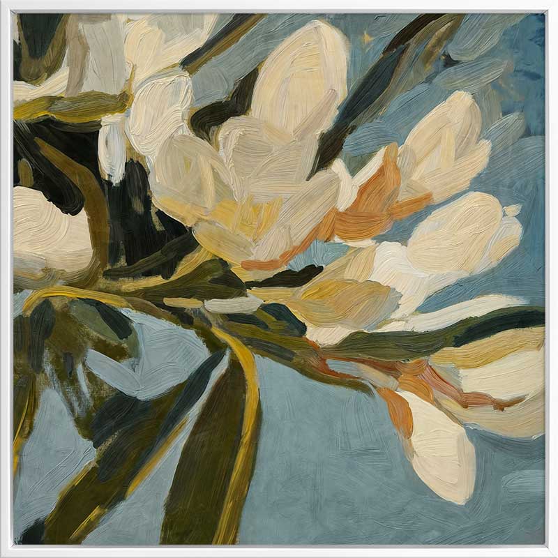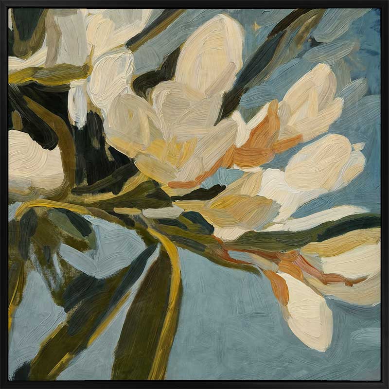 Flowering Hour I Canvas Art Print - Evocative and softly romantic, this floral artwork portrays delicate flowers through subtle brushwork, creamy whites, deep greens, and calming blue tones. This contemporary botanical artwork radiates peaceful warmth, ideal for spaces desiring gentle, sophisticated floral art.
