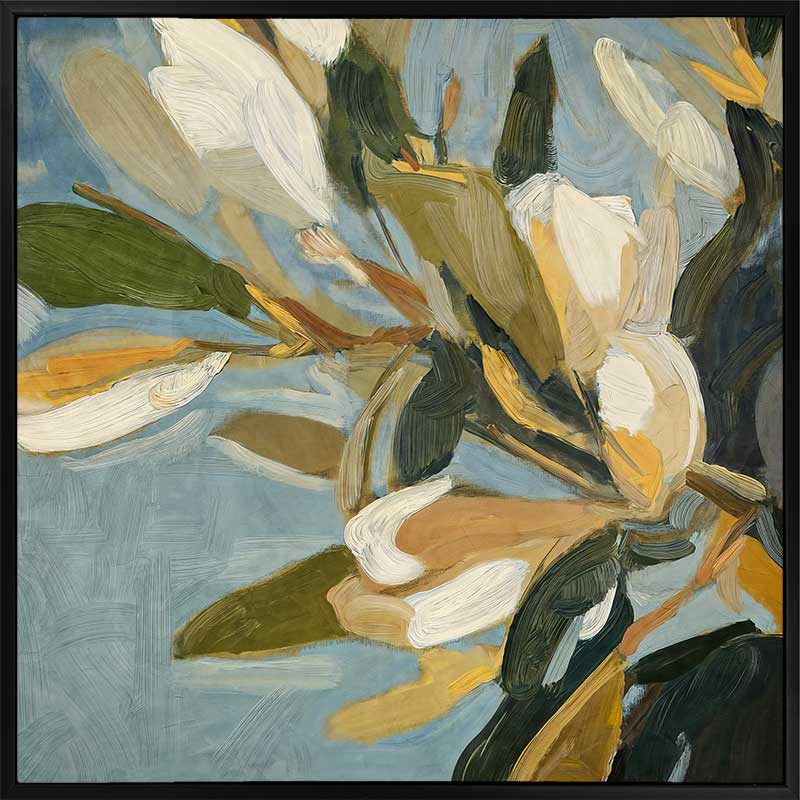 Flowering Hour II Canvas Art Print - Evocative and softly romantic, this floral artwork portrays delicate flowers through subtle brushwork, creamy whites, deep greens, and calming blue tones. This contemporary botanical artwork radiates peaceful warmth, ideal for spaces desiring gentle, sophisticated floral art.