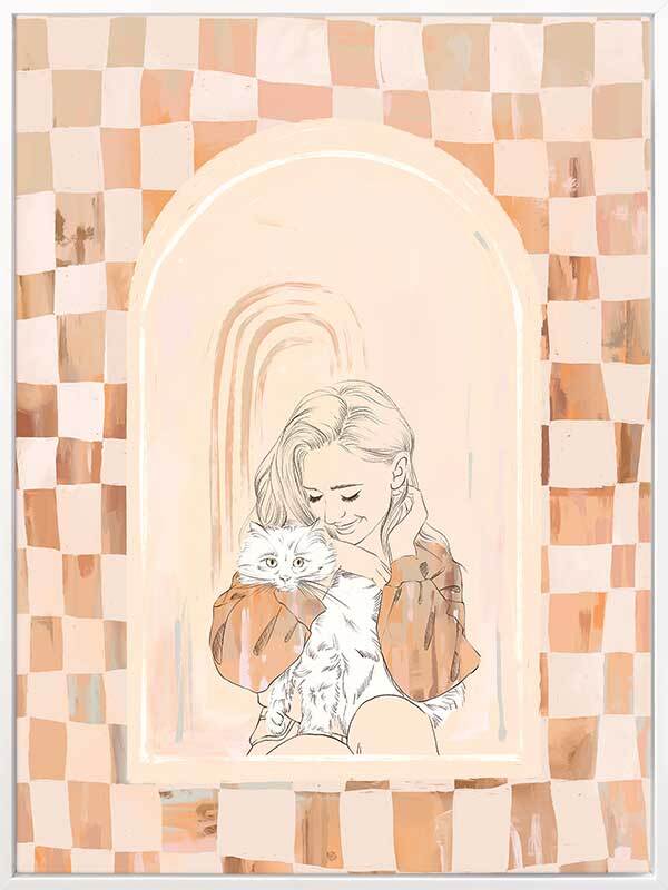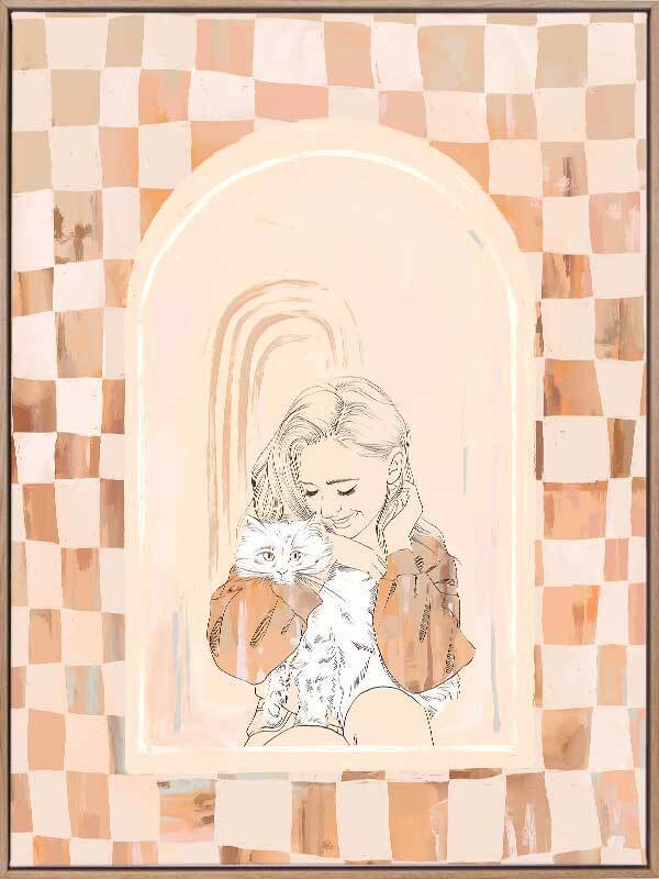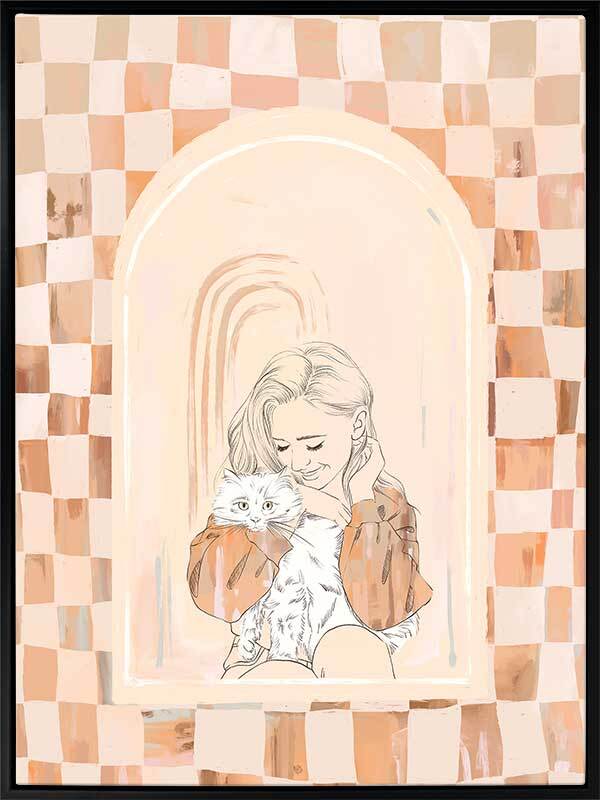 Fluffball Canvas Art Print - For all the cat lovers out there, this adorable piece depicts that everlasting fluffball love oh-so-perfectly. With soft linework and two-tone palette of soft pink and warm peachy shades, this piece will breathe colour into any neutral space. A wonky checkerboard pattern in the background brings a laidback, comforting feel, with silhouette imagery in the centre to capture a perfect moment in time.