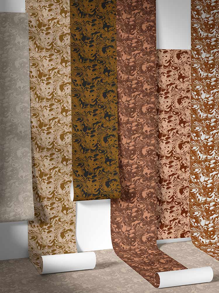 Swirled organic forms in soft tonal hues create an expressive design, inspired by natural movement. Fluid is a dramatic yet calming design that thrives in bathrooms, living spaces, or anywhere looking to embrace an aesthetic wallpaper look. Available in deep terracotta, cocoa brown, blush, sandstone, burnt orange, golden ochre, caramel, and neutral.