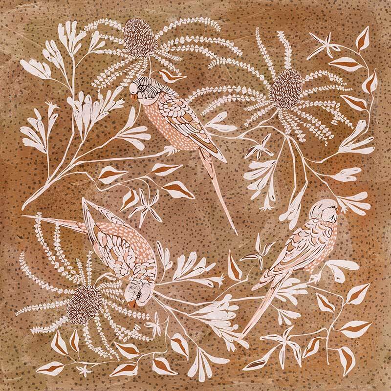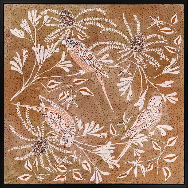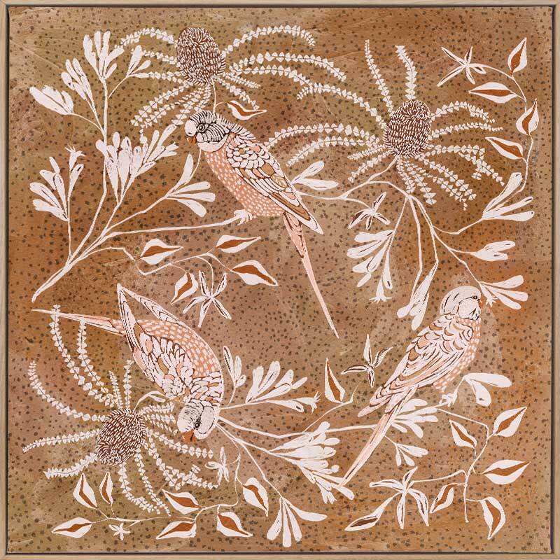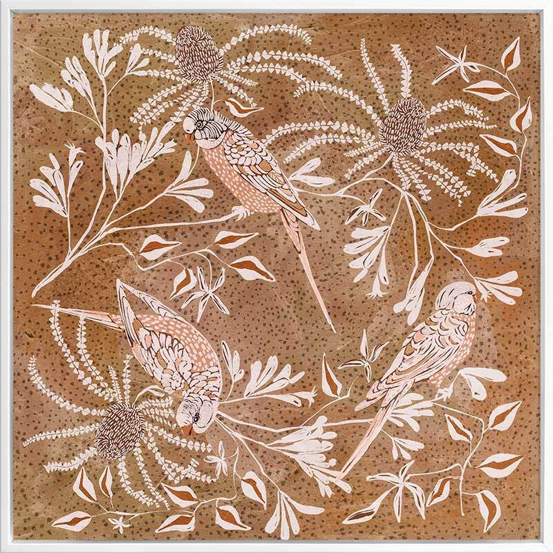 Fluttering in Florals Canvas Art Print - Immerse yourself in the melodious symphony of harmonious birdsong, where the gentle rustle of leaves and the graceful flutter of feathers create a serene orchestra. This captivating artwork beautifully captures the essence of Australia's native flora and fauna, igniting a sense of awe and whimsy. With its delicate composition of dots, lines, and a subdued palette of warm browns, pale whites, and blush pinks, it radiates a serene and tranquil energy that envelops your home. Experience the sweet serenade of nature and invite a touch of delicate beauty into your space with this breathtaking masterpiece that will transport you to a world of enchantment.