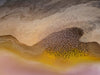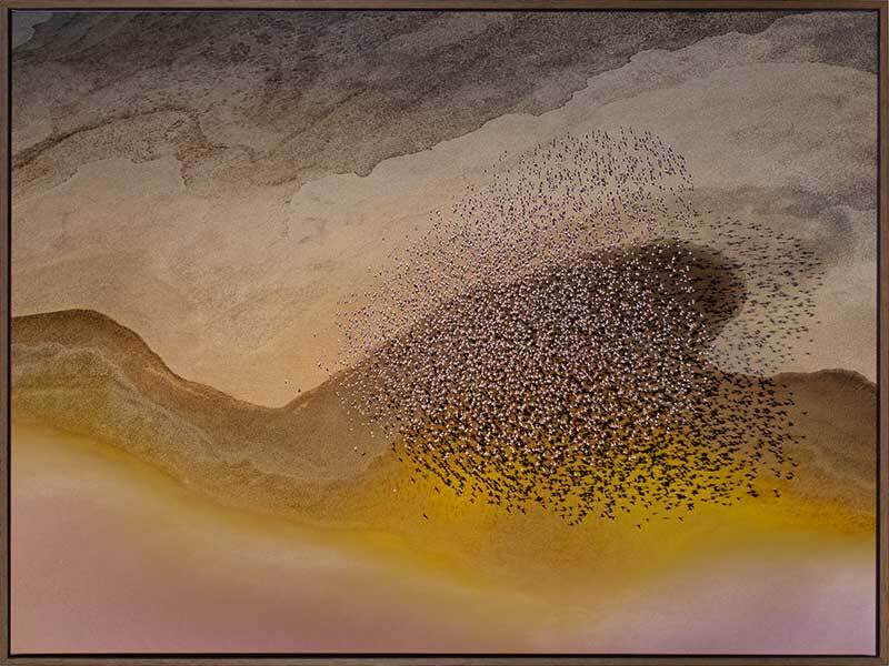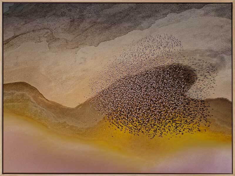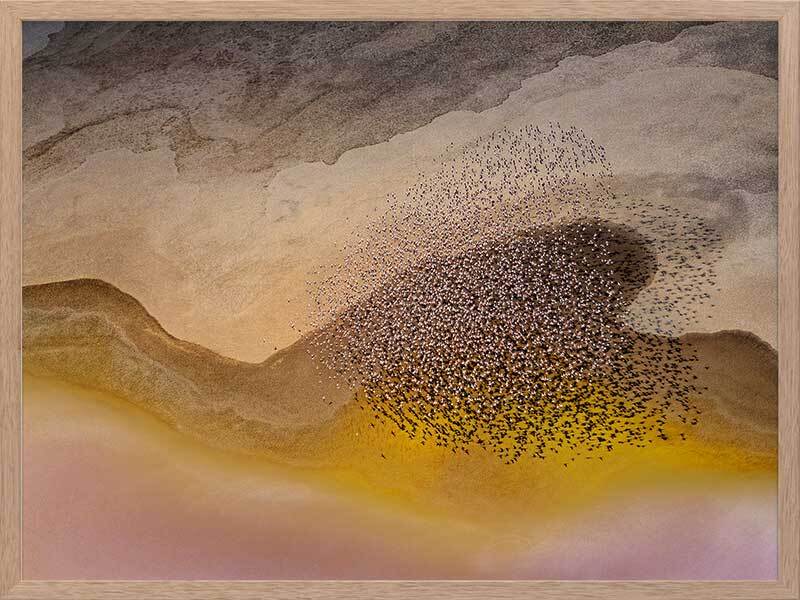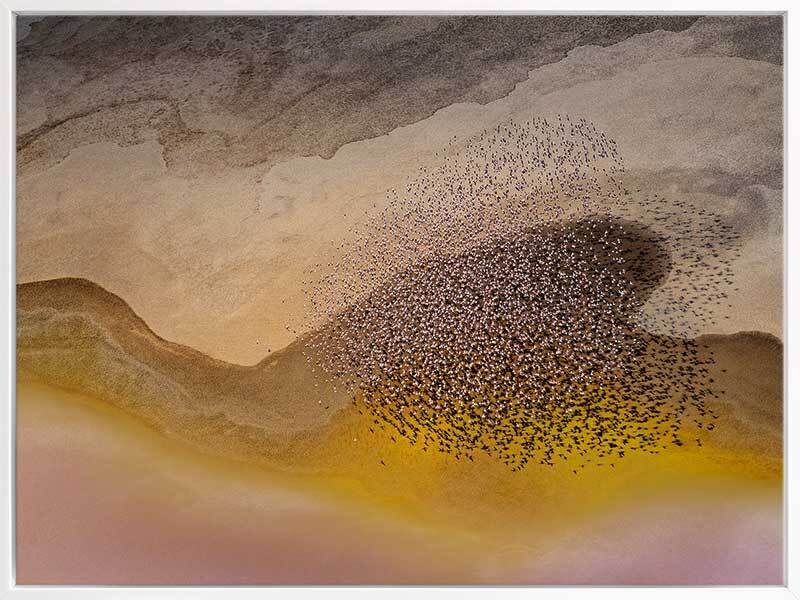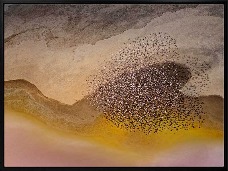 Fly By Lake Canvas Art Print - A stunning photographic artwork featuring a flock of flamingos flying above a large pink, yellow and brown coloured lake. THE CURATED SERIES A handpicked gallery of daringly quirky photographic pieces exploding with richness of colour and texture.