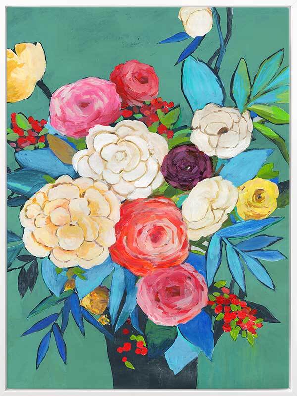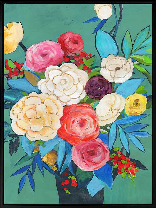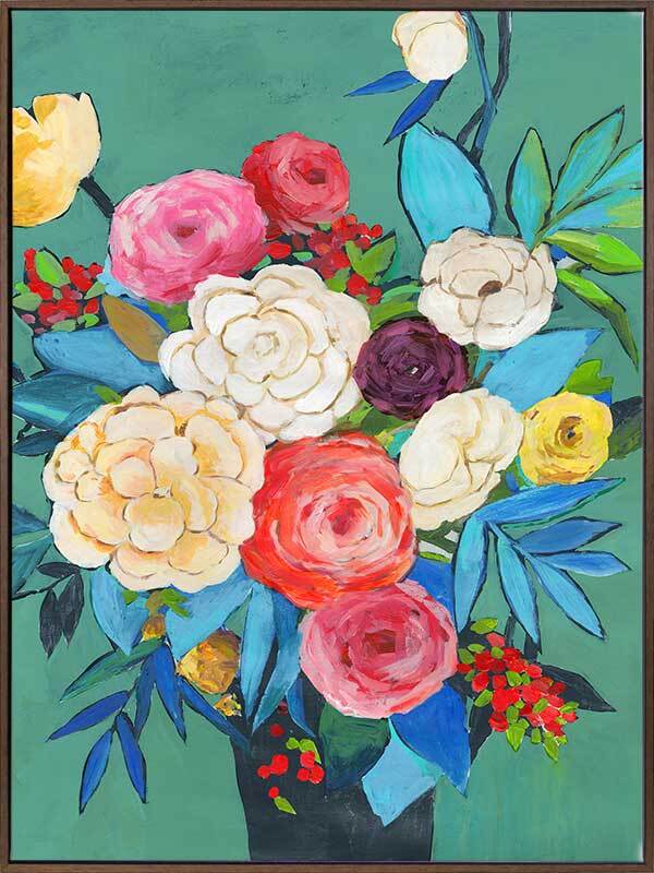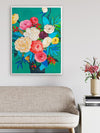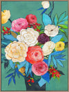 Folk Bouquet Canvas Art Print - Why buy real flowers when these will last a lifetime? A beautiful statement piece, this artwork uses a classic contrast between cool and warm tones to brighten up any space, with vibrant oranges, pinks and yellows popping against rich blues and greens. Featuring soft outline detailing, this has an abstract feel to it for a more dynamic look.