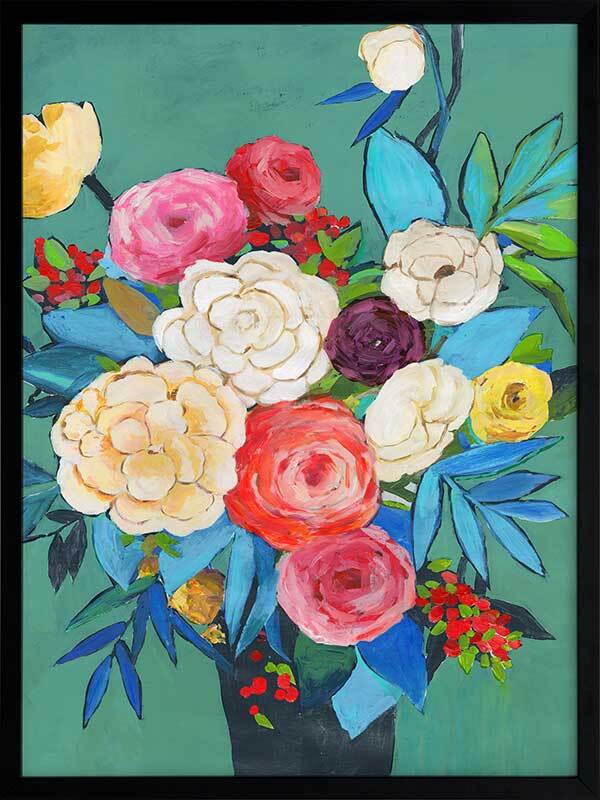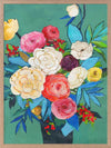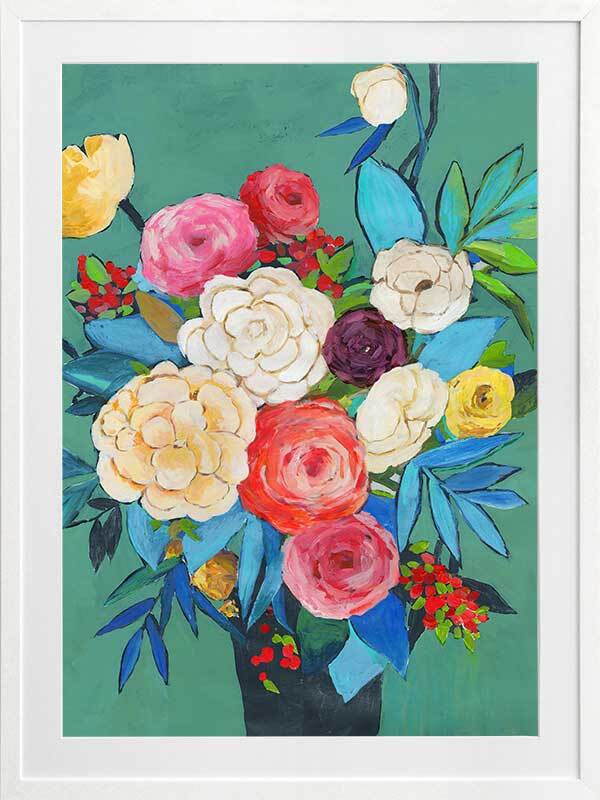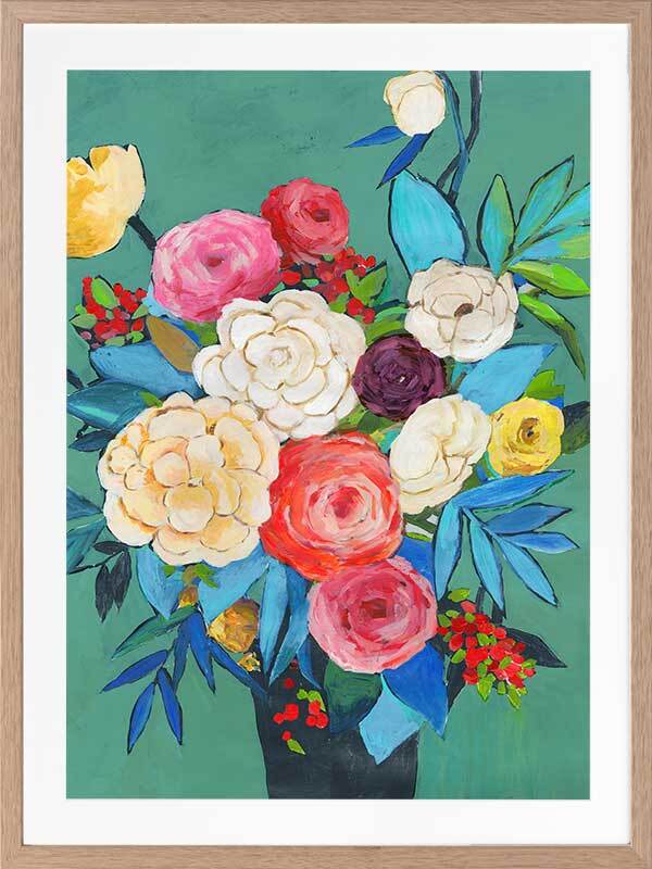 Folk Bouquet Framed Art Print - Why buy real flowers when these will last a lifetime? A beautiful statement piece, this artwork uses a classic contrast between cool and warm tones to brighten up any space, with vibrant oranges, pinks and yellows popping against rich blues and greens. Featuring soft outline detailing, this has an abstract feel to it for a more dynamic look.