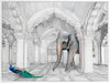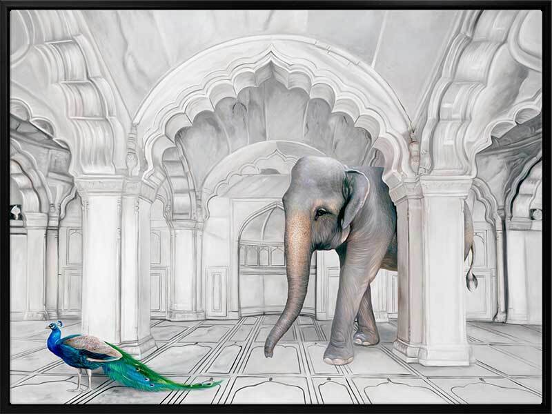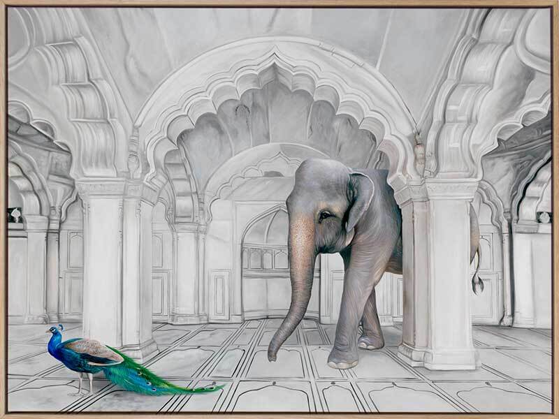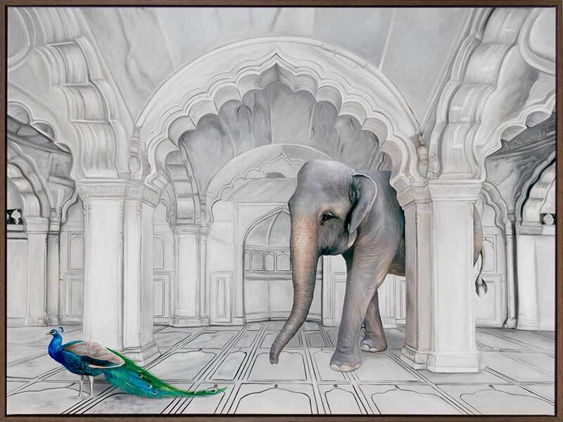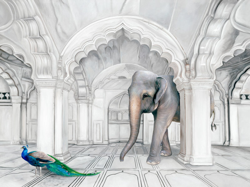 Follow the Leader Canvas Art Print: An eccentric art print that features an elephant following a peacock inside a grand marble palace. This is a print of an original hand painted oil painting with small detailed brush strokes on canvas. 2020 AUTUMN/WINTER COLLECTION: REVERIE