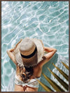 Forever Vacation Canvas Art Print - This vibrant photographic art print transports you to a sun-drenched coastal escape. A woman in a wide-brimmed hat lounges by a sparkling pool, her relaxed posture inviting you to unwind. The vivid turquoise waters and warm sunlight create a serene, dreamy atmosphere.