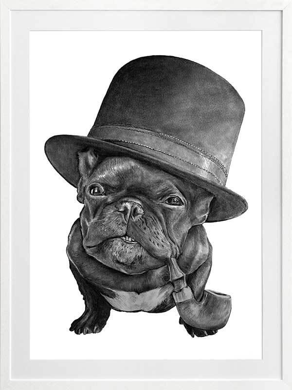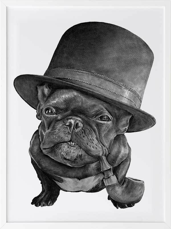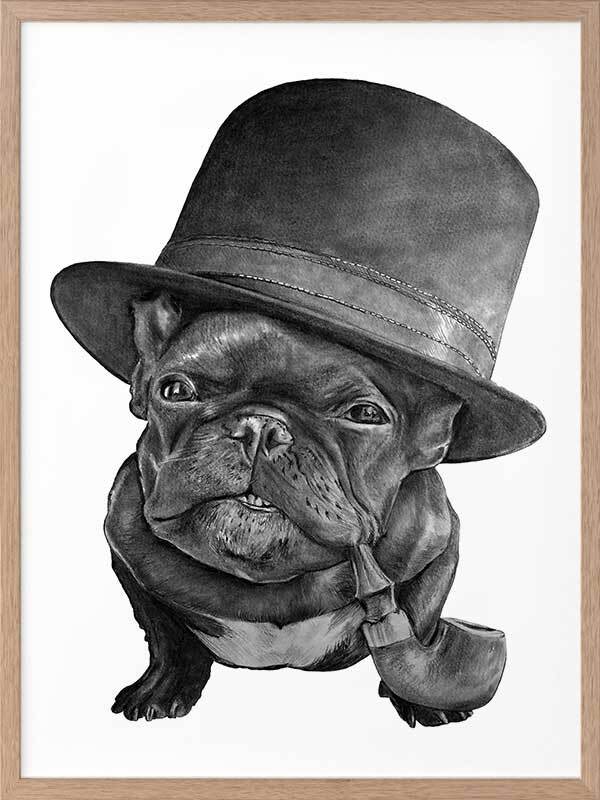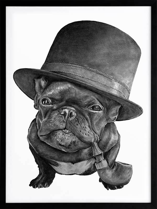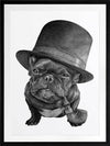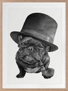 Free Monte Framed Art Print - This distinguished pug is as cute as ever with his very own top hat and pipe, with wisdom in his eyes and a skip in his step. With such a playful undertone, this piece keeps things subtle with a subdued monochrome palette and stark white backdrop, with realistic detailing for a photo-like finish.