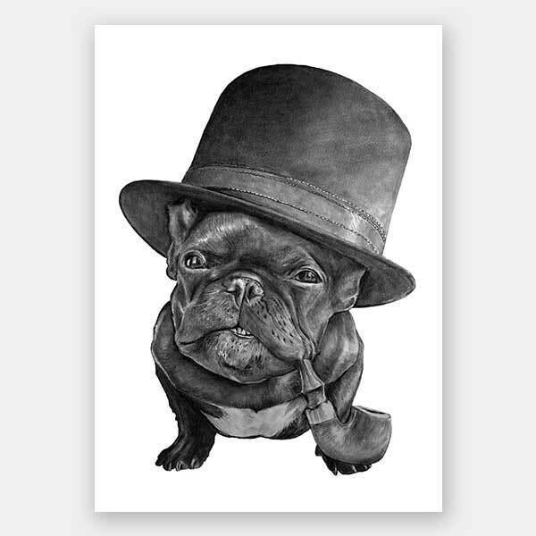 Free Monte Unframed Art Print - This distinguished pug is as cute as ever with his very own top hat and pipe, with wisdom in his eyes and a skip in his step. With such a playful undertone, this piece keeps things subtle with a subdued monochrome palette and stark white backdrop, with realistic detailing for a photo-like finish.