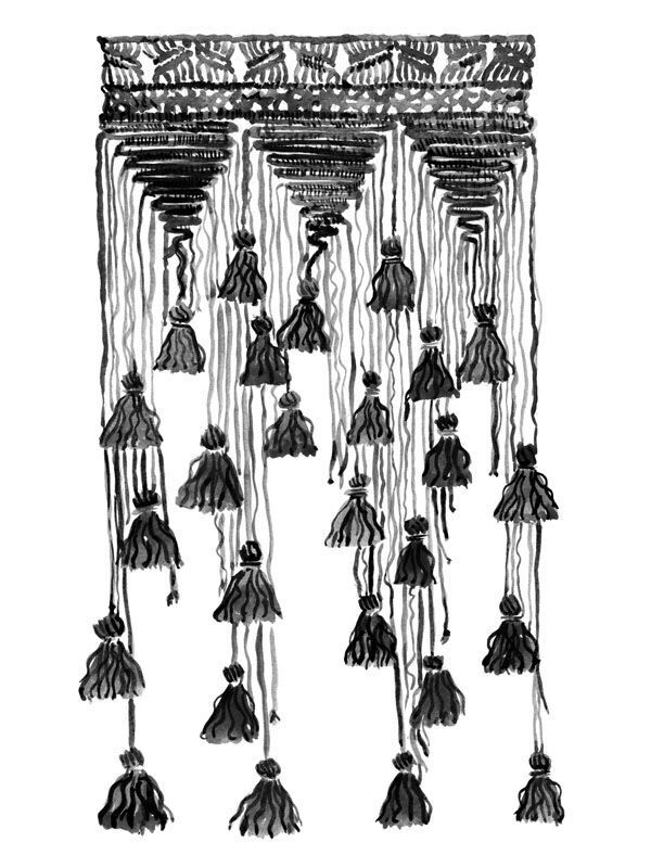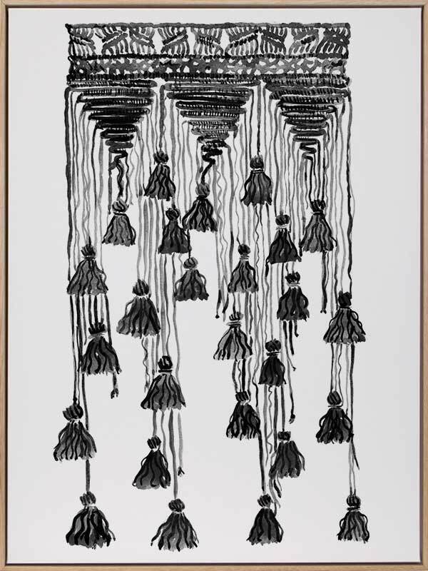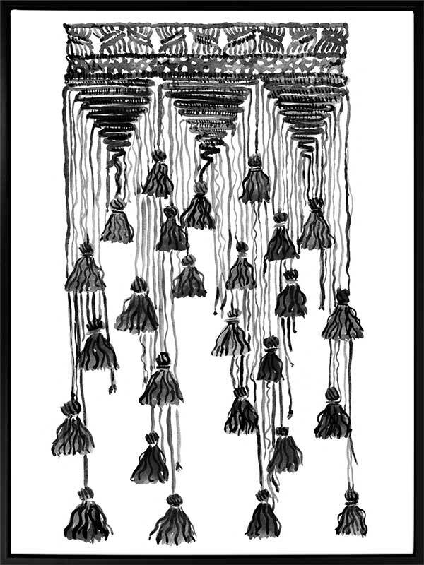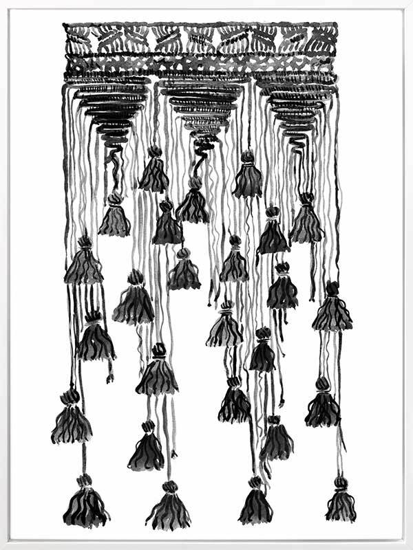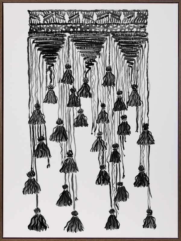 Free Spirit Charcoal Canvas Art Print: A wonderfully detailed watercolour illustration of a bohemian macrame wall hanging in black and white. 2017 SPRING/SUMMER COLLECTION: RHAPSODY