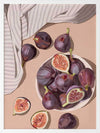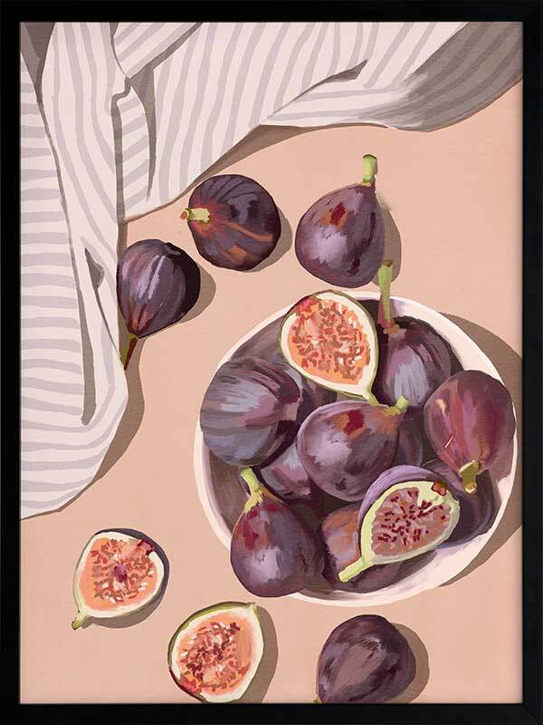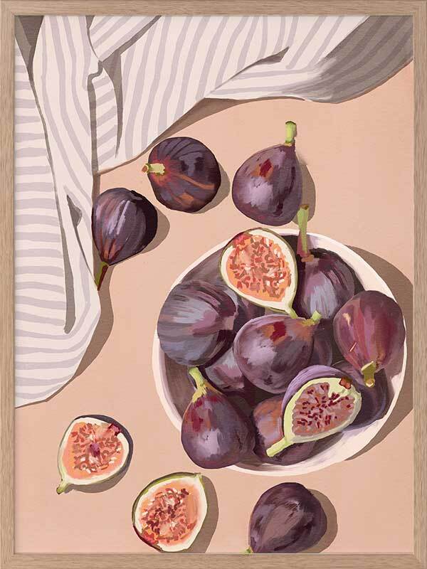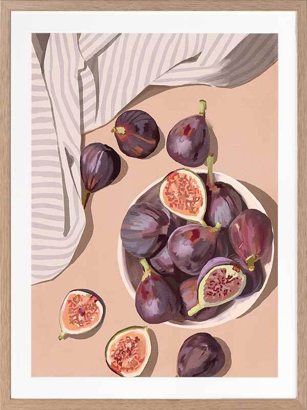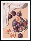 Fresh Figs Framed Art Print - As the sweet scent of freshly sliced figs fills the warm summer air, you sit down at the table for a tall glass of lemonade, ready for a few laughs surrounded by some good company. This piece has a painterly quality to it, with smooth brush strokes and texture, with a soft colour palette ranging from delicious deep purples, juicy orange, and soft green with a peachy beige background. You can almost reach right out and grab half a slice.