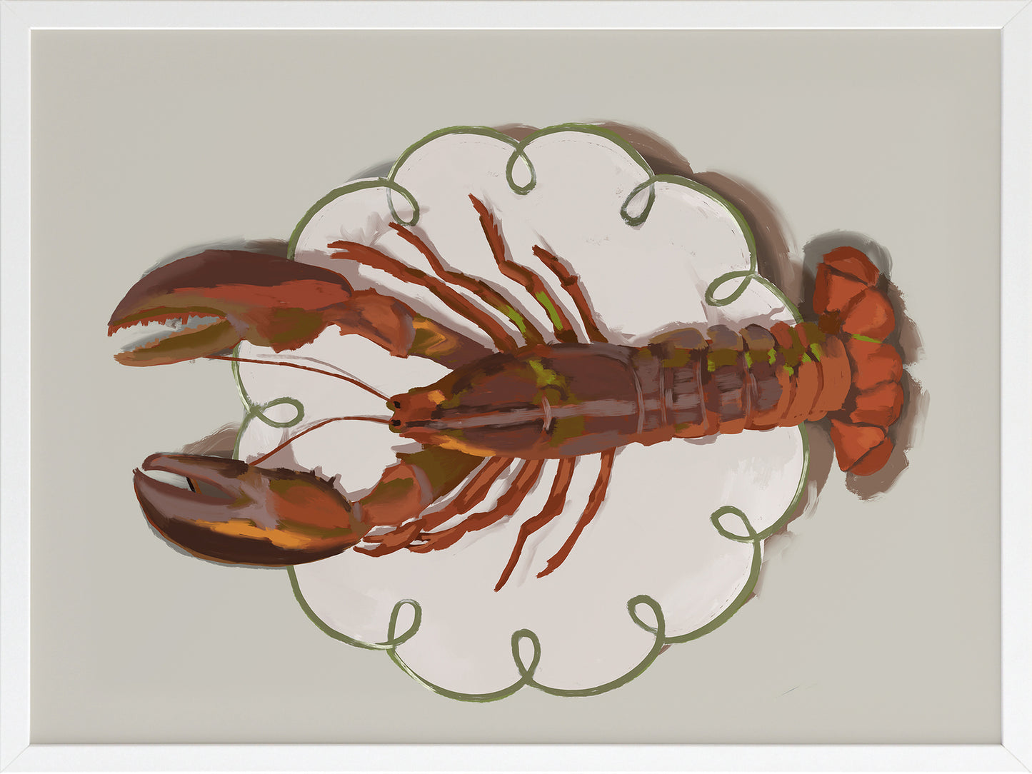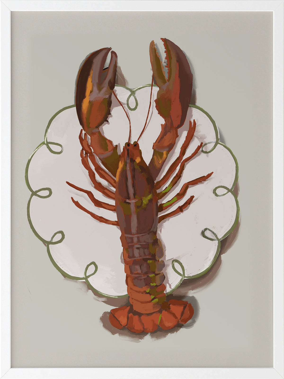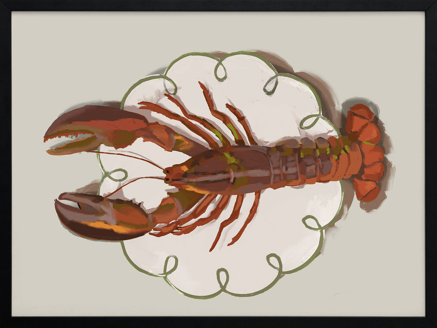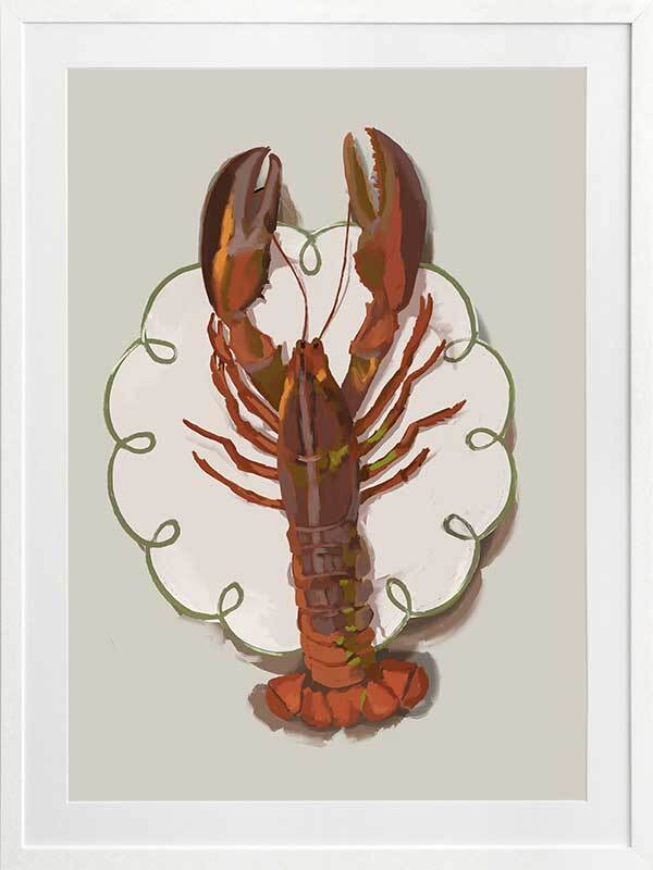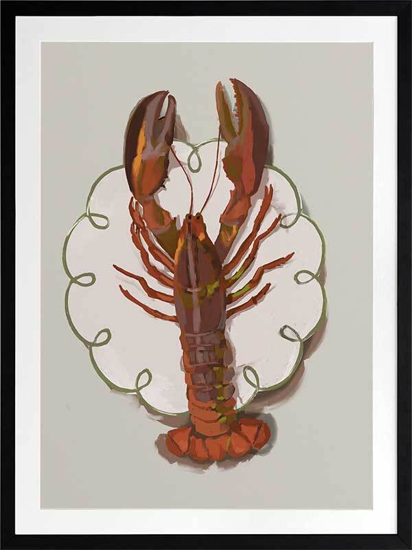 Freshwater Beige Framed Art Print - A captivating still life piece leaving this freshly caught freshwater crayfish front-and-centre, illuminated by a white decorative plate against a simple beige-toned backdrop. Palette also includes reddish-brown tones used for the crayfish, and ivory white for the plate.