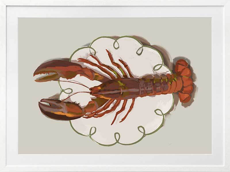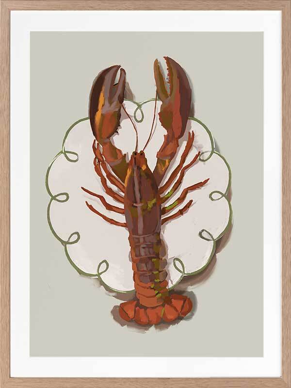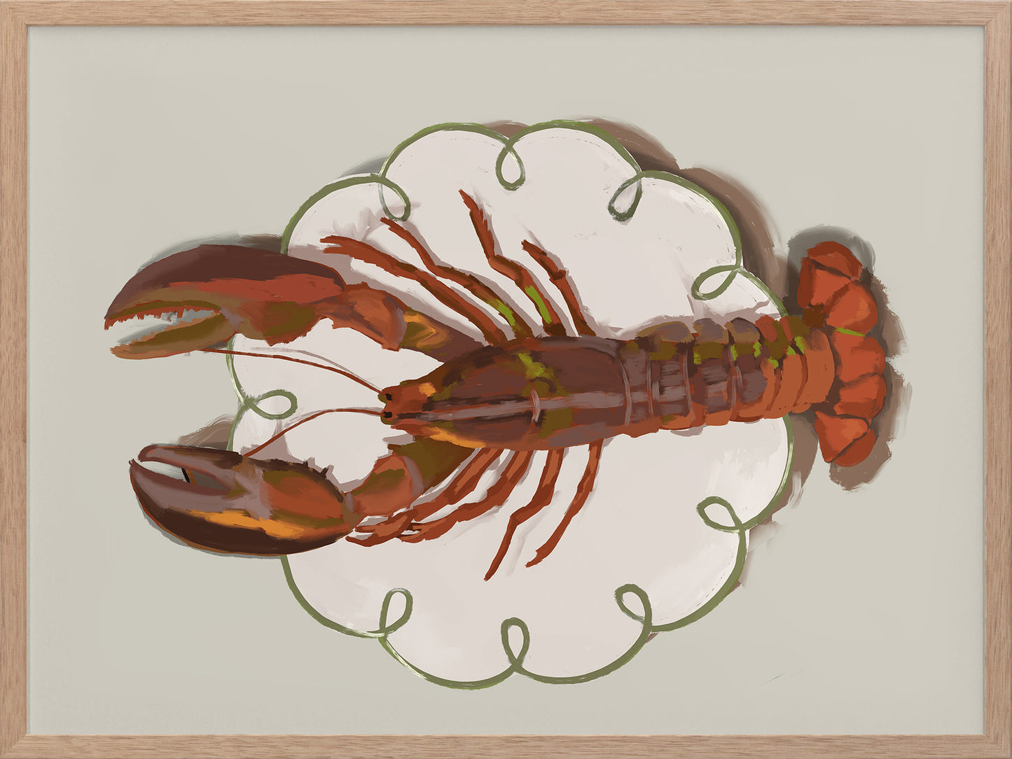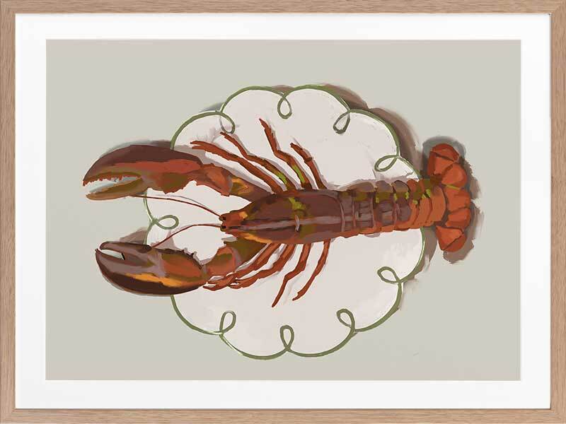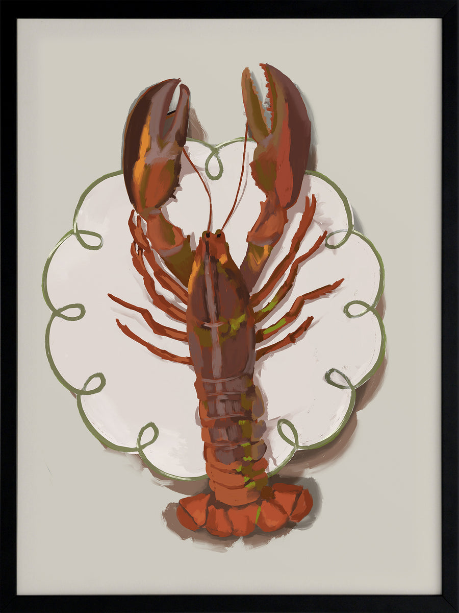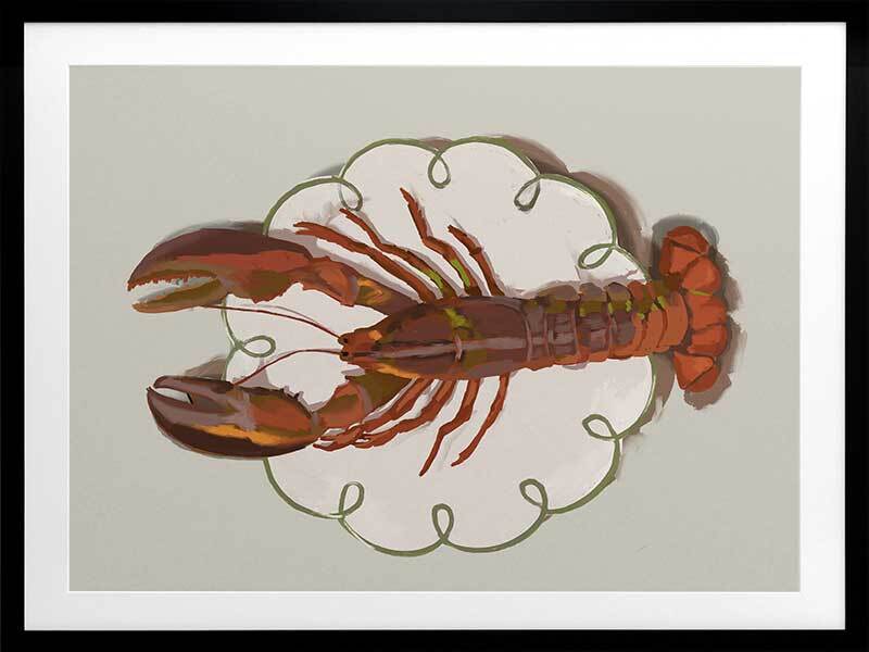 Freshwater Beige Framed Art Print - A captivating still life piece leaving this freshly caught freshwater crayfish front-and-centre, illuminated by a white decorative plate against a simple beige-toned backdrop. Palette also includes reddish-brown tones used for the crayfish, and ivory white for the plate.
