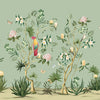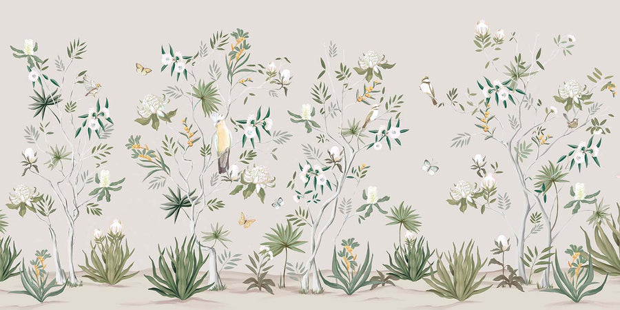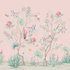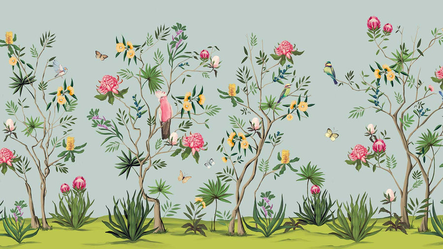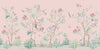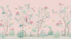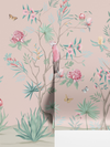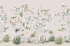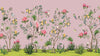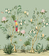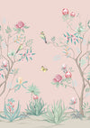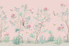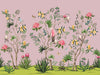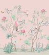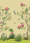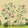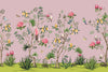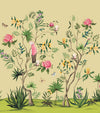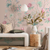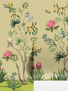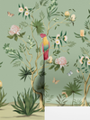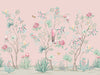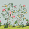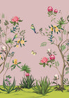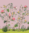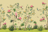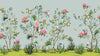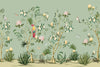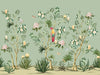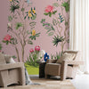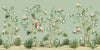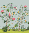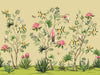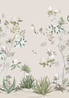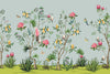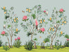 Frolic Among the Flowers Wallpaper Mural - A whimsical garden in full bloom, this wallpaper mural with a chinoiserie design brings the beauty of wildflowers and lush greenery into your space. Birds flit between the foliage, adding a playful and lively charm to this enchanting scene.