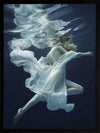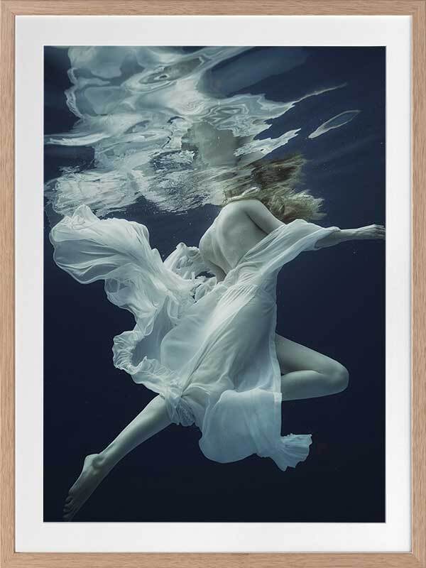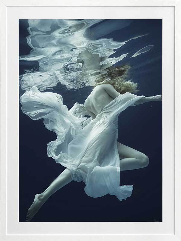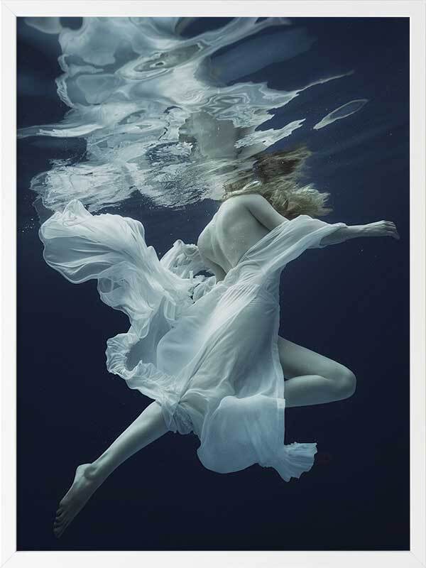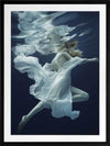 Full of Grace Framed Print - This wall art features a photograph of a graceful woman floating in a deep blue expanse of water. Her flowing soft white fabric evokes a dreamy feeling floating seductively around her. THE CURATED SERIES A handpicked gallery of wall art photography that is daringly and quirky, these photographic pieces are exploding with richness of colour and texture.