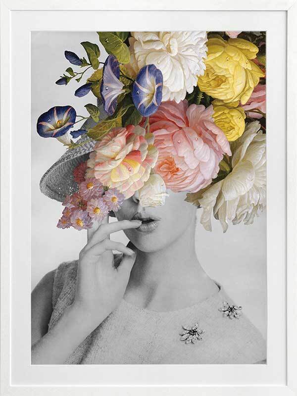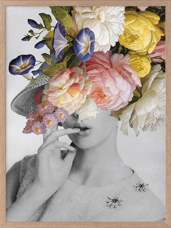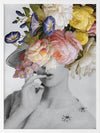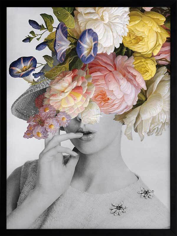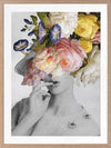 Garden Party I Framed Art Print - A stunning piece for any room, this artwork plays with pops of colour, as well as the contrast between new and old. A blooming bouquet of fresh flowers in the foreground establish a contemporary feel, while the woman in the background wears vintage clothing with a soft black and white hue.