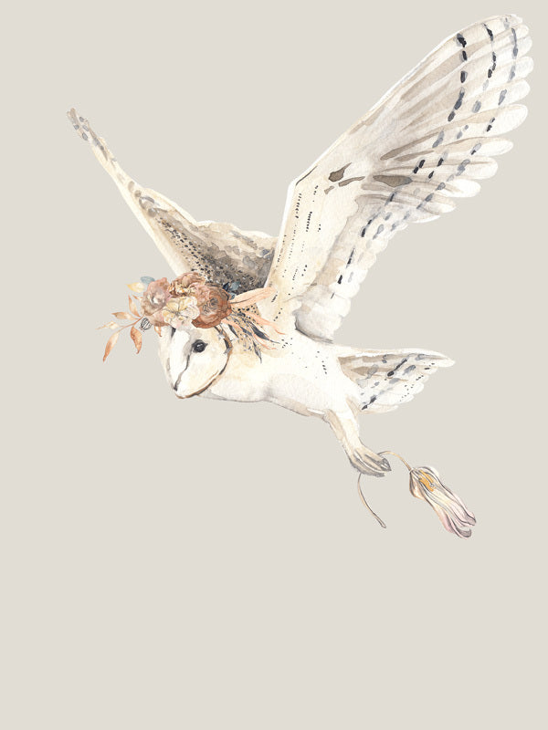 Gatherer - A beautiful watercolour painted owl with a flower crown flies against a beige background.
