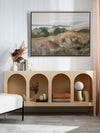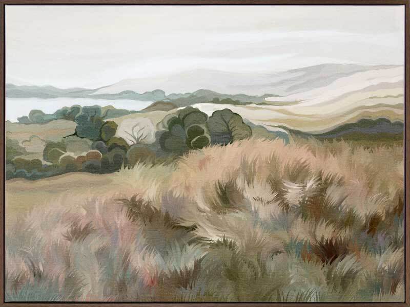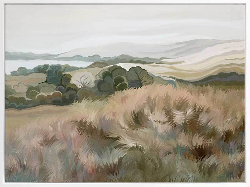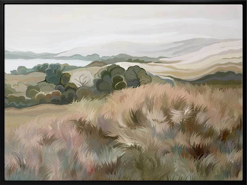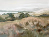 Gentle Breeze Canvas Art Print - Staring off into the distance, a gentle breeze sweeps by, the tall grass swaying about like a choreographed dance. Using various tones of khaki greens, soft pinks and oranges, and a touch of light purple and blue, this landscape piece is the perfect addition to any space to remind you of faraway places and long summer days.