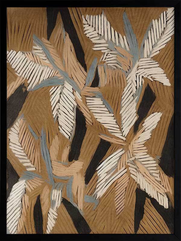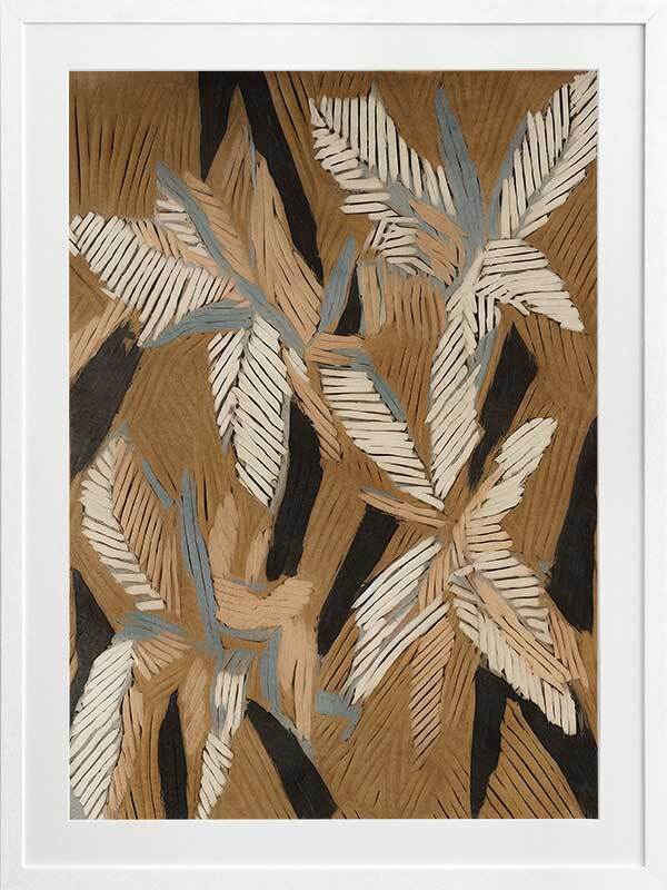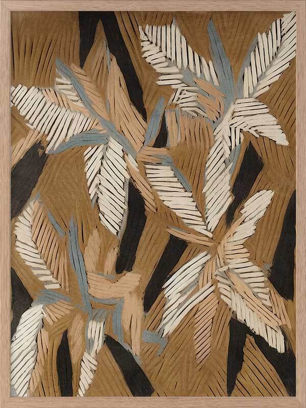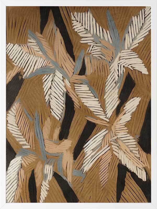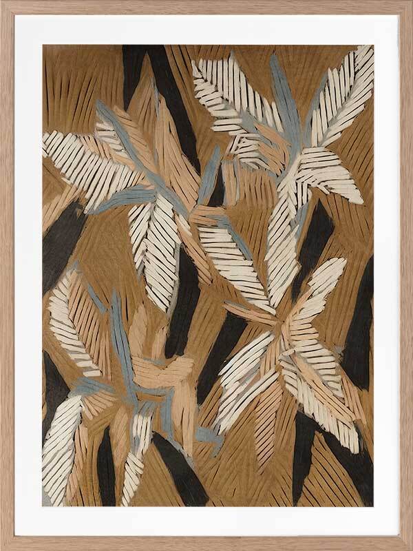 Geometric Gum Leaves II Framed Art Print - This abstract canvas art is a playful, eye-catching take on eucalyptus leaves, with an array of lines that create an organic geometric look. Perfect for adding some movement and character to your space, this modern art print has a versatile palette of brown, beige, and blue shades. Pair with Geometric Gum Leaves I.