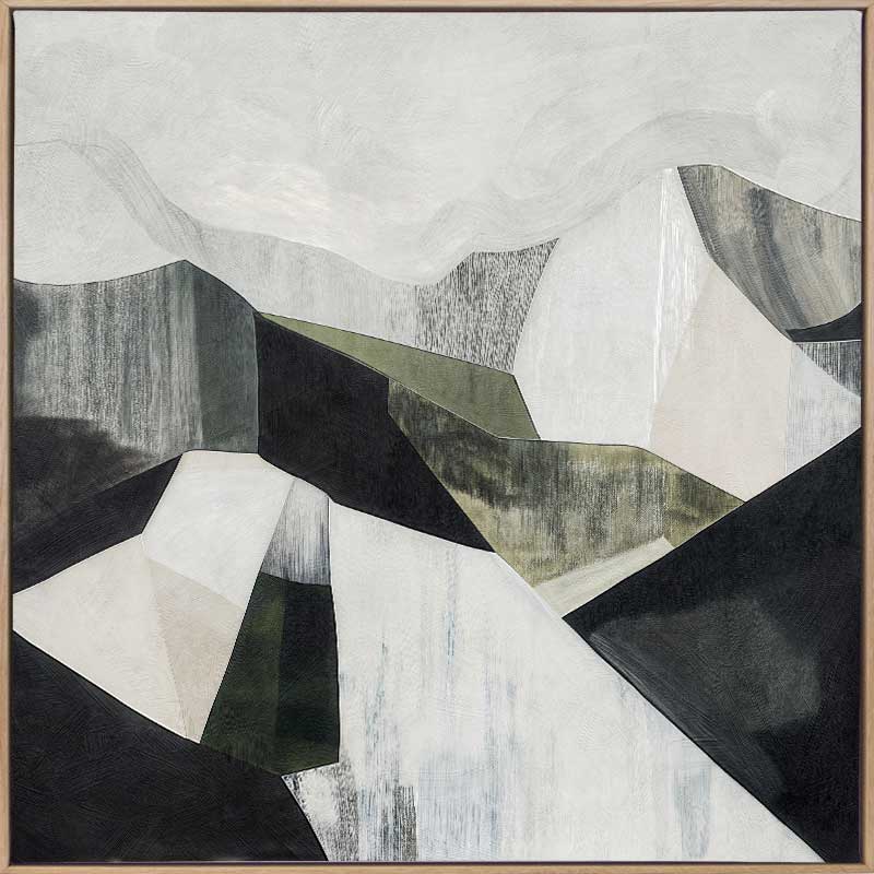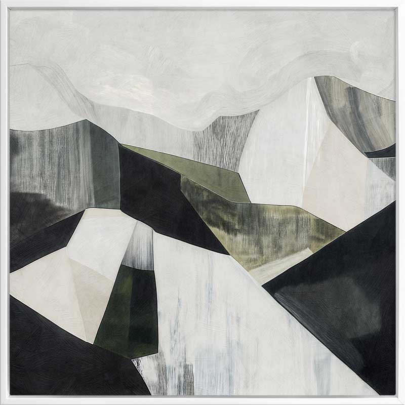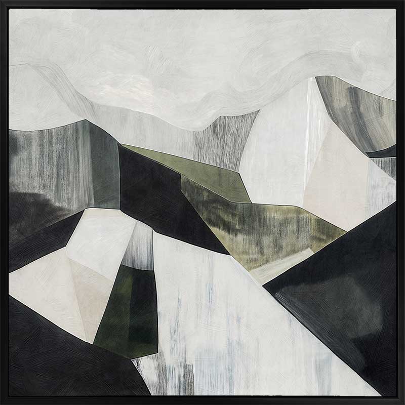 Geometric Landscape II Canvas Art Print - Modern minimalism meets abstract landscapes in this captivating art print. Defined by bold geometric forms in soft greys, muted greens, and black-and-white contrasts, this piece elegantly balances simplicity and depth. Perfect for contemporary interiors seeking sophistication, this minimalist artwork offers tranquillity, structure, and stylish calm.