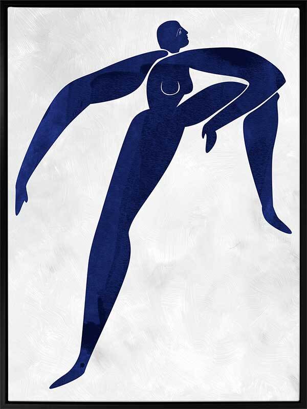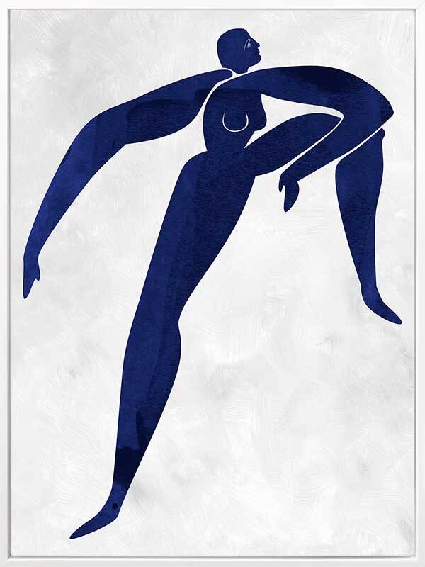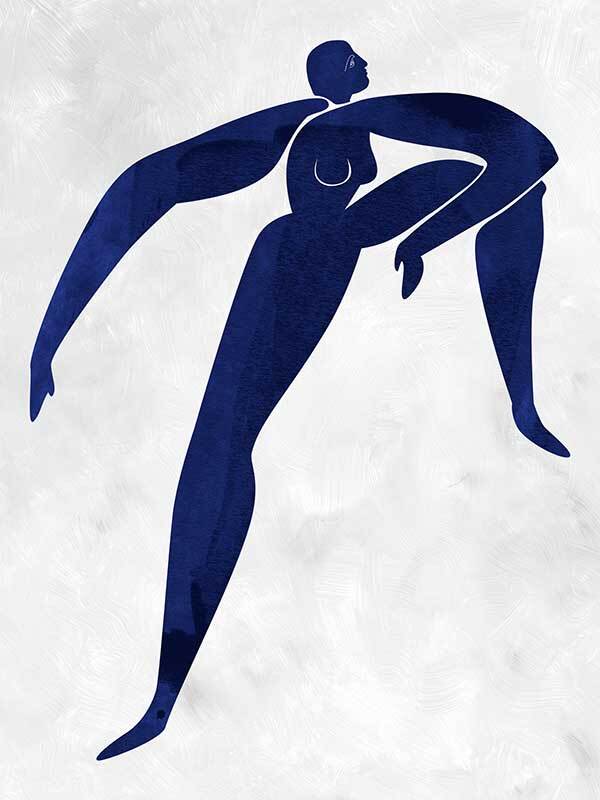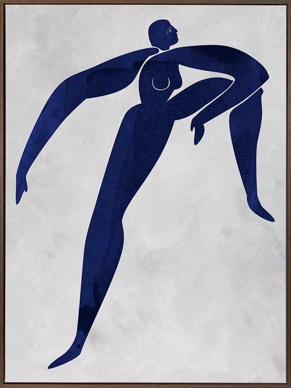 Gertrude Cut-Out II Canvas Art Print - Drawing inspiration from the iconic cut-out style artwork from modern art master Matisse, this artwork features a simplistic, caricature-like portrait of a figure with exaggerated limbs. The colour palette is bold and vibrant, featuring a deep, indigo blue coloured figure against a light grey textured background. This artwork has been created to match with Gertrude Cut-Out I, III and IV.