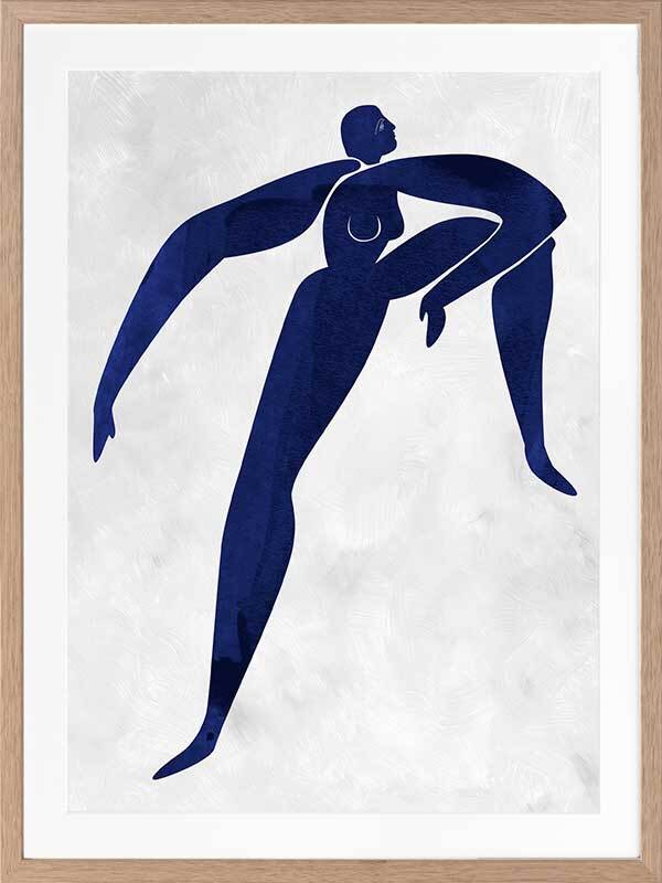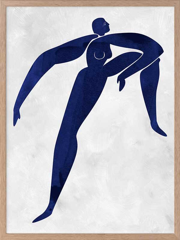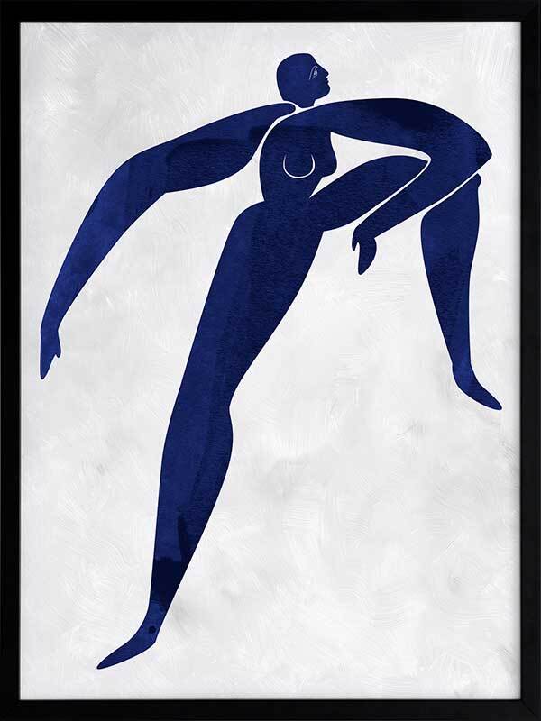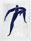 Gertrude Cut-Out II Framed Art Print - Drawing inspiration from the iconic cut-out style artwork from modern art master Matisse, this artwork features a simplistic, caricature-like portrait of a figure with exaggerated limbs. The colour palette is bold and vibrant, featuring a deep, indigo blue coloured figure against a light grey textured background. This artwork has been created to match with Gertrude Cut-Out I, III and IV.