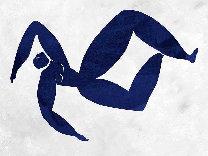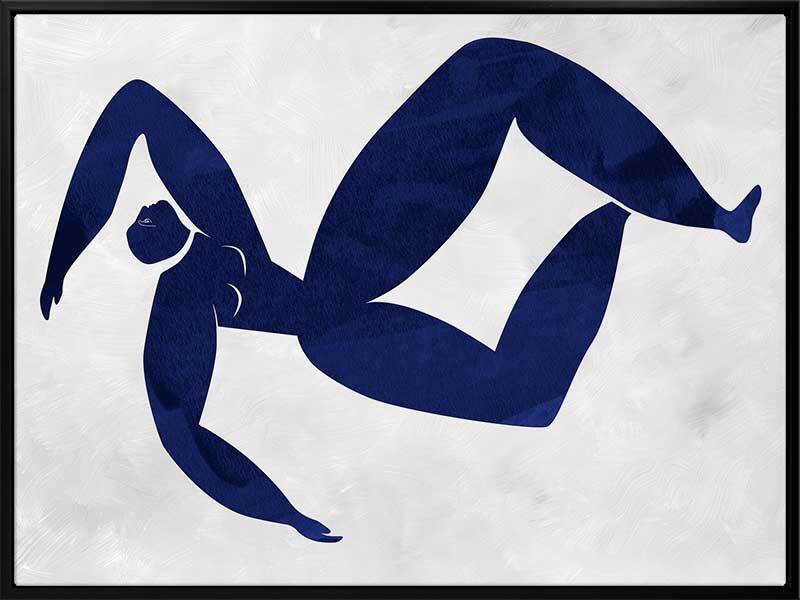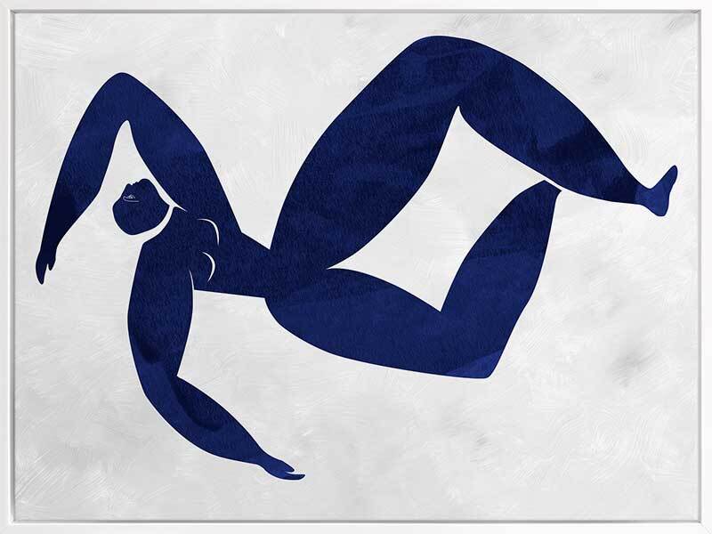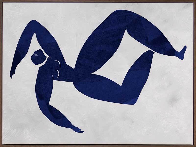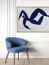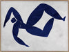 Gertrude Cut-Out III Canvas Art Print - Drawing inspiration from the iconic cut-out style artwork from modern art master Matisse, this artwork features a simplistic, caricature-like portrait of a figure with exaggerated limbs. The colour palette is bold and vibrant, featuring a deep, indigo blue coloured figure against a light grey textured background. This artwork has been created to match with Gertrude Cut-Out I, II and IV.