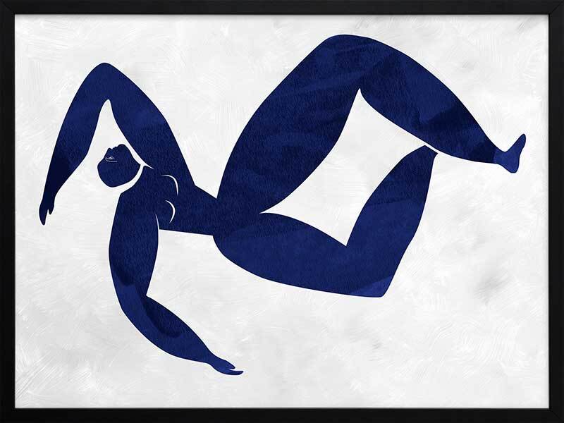 Gertrude Cut-Out III Framed Art Print - Drawing inspiration from the iconic cut-out style artwork from modern art master Matisse, this artwork features a simplistic, caricature-like portrait of a figure with exaggerated limbs. The colour palette is bold and vibrant, featuring a deep, indigo blue coloured figure against a light grey textured background. This artwork has been created to match with Gertrude Cut-Out I, II and IV.