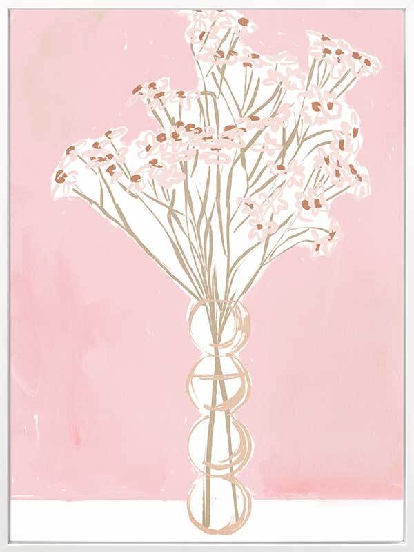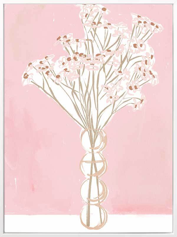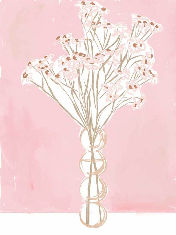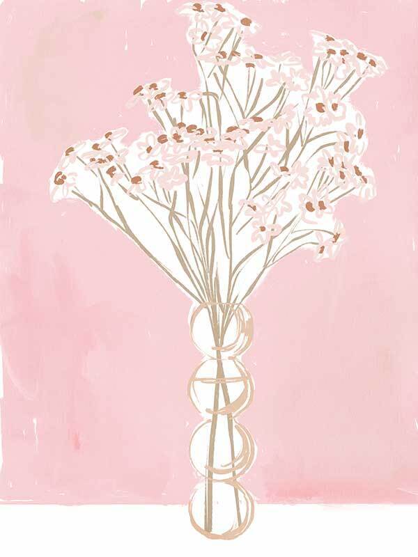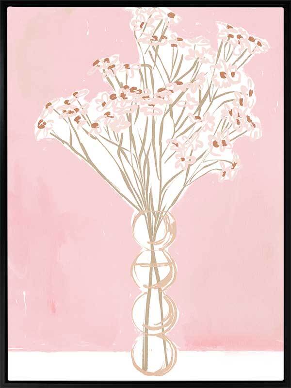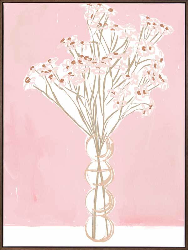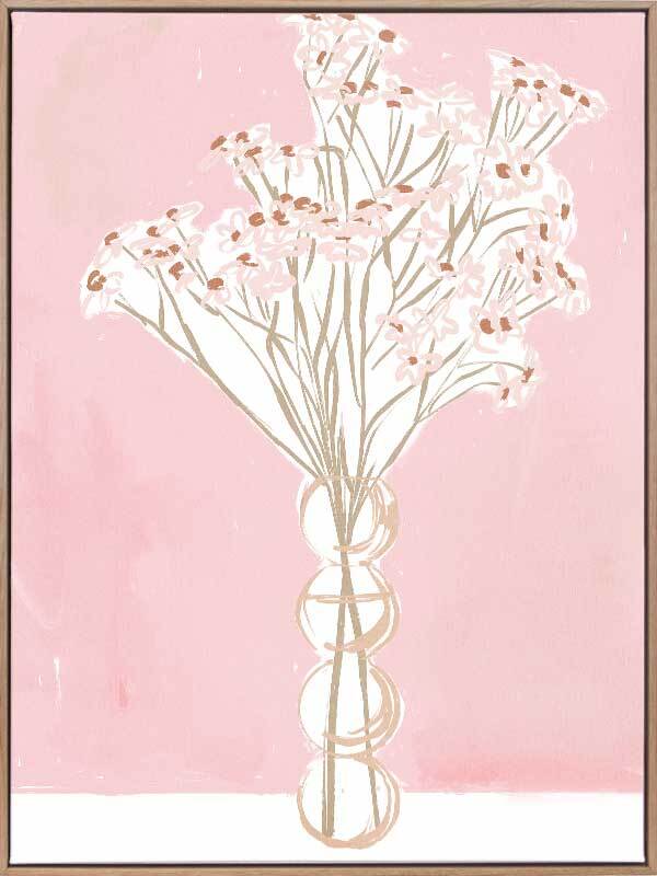 Getaway I Canvas Art Print - Bring back memories of relaxing getaways with the simple, understated energy of this vase of blooming flora, held by our dreamy Luella Glass Vase. Featuring minimal details and linework, with a modest palette of soft pink, white and light beige, this piece is easily incorporated into any interior style.