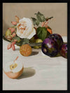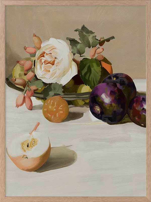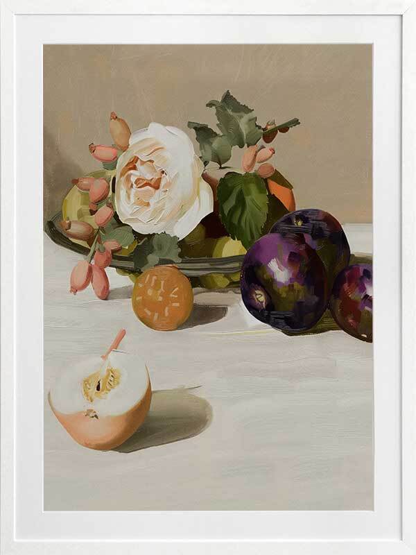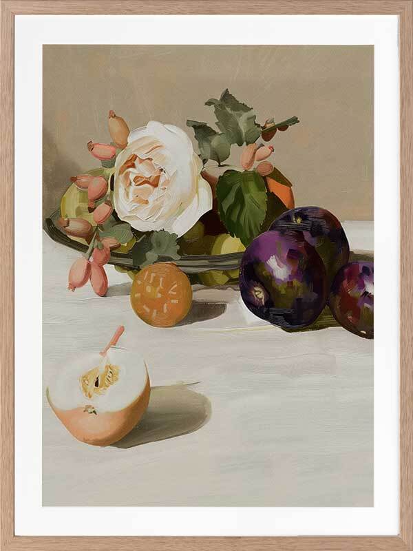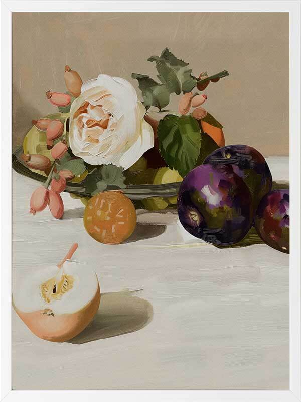 Gifts from the Garden Framed Art Print - Infuse your kitchen or dining space with the elegant, farmhouse charm of this still life artwork by Darren Palmer. Featuring rich purples, soft pinks, and vibrant greens, this art print of an arrangement of fruits and flowers embodies a rustic-refined feel, making it perfect for farmhouse interior design styles.