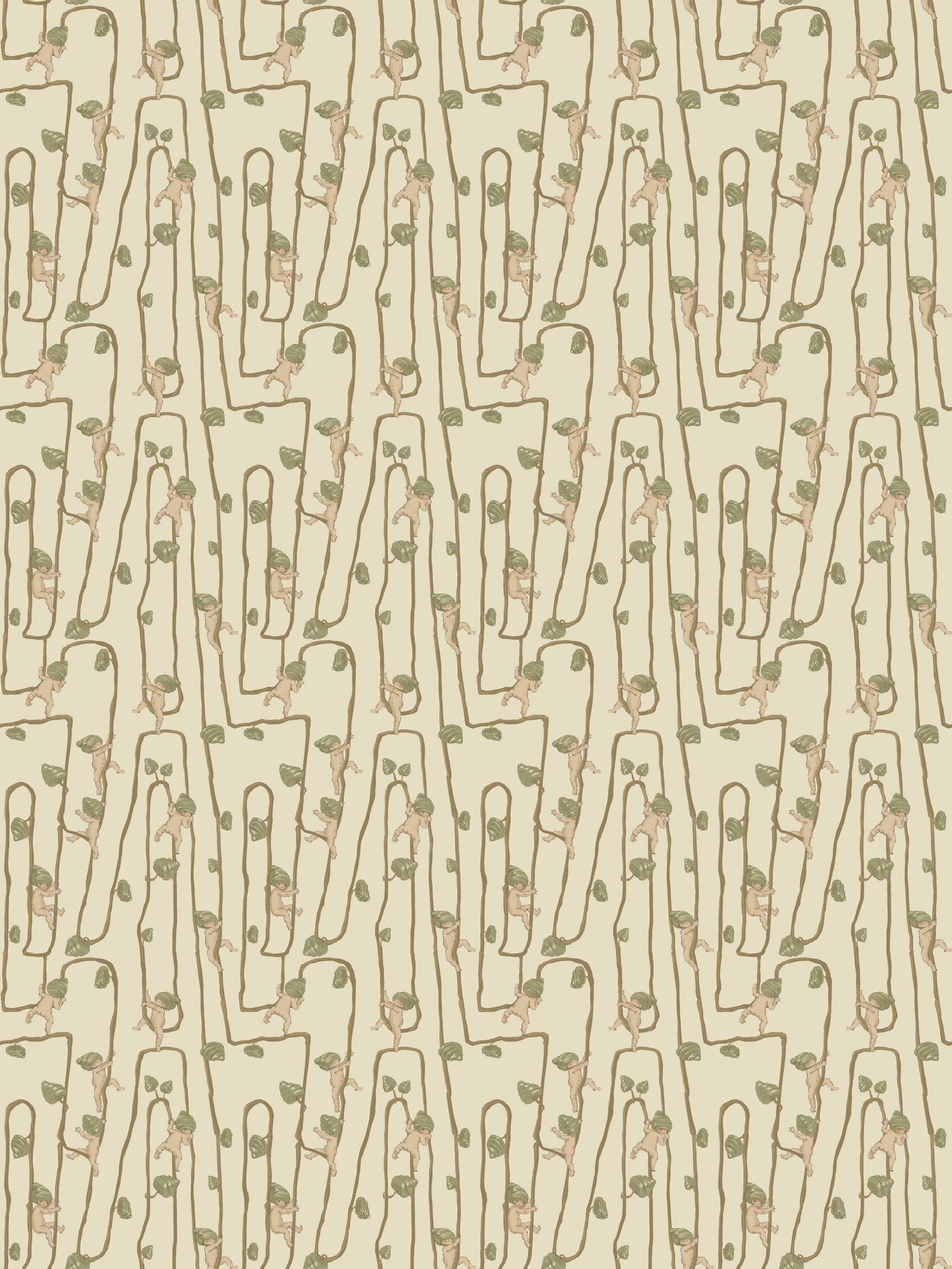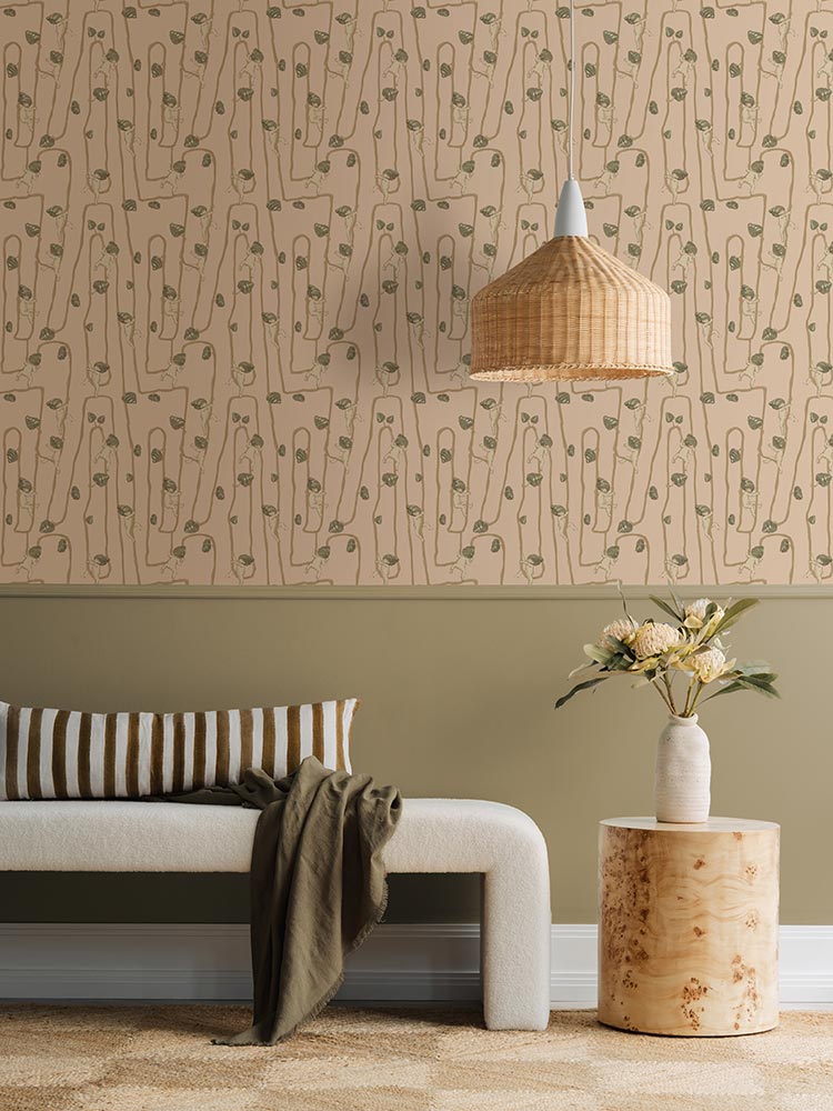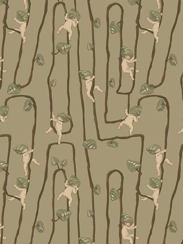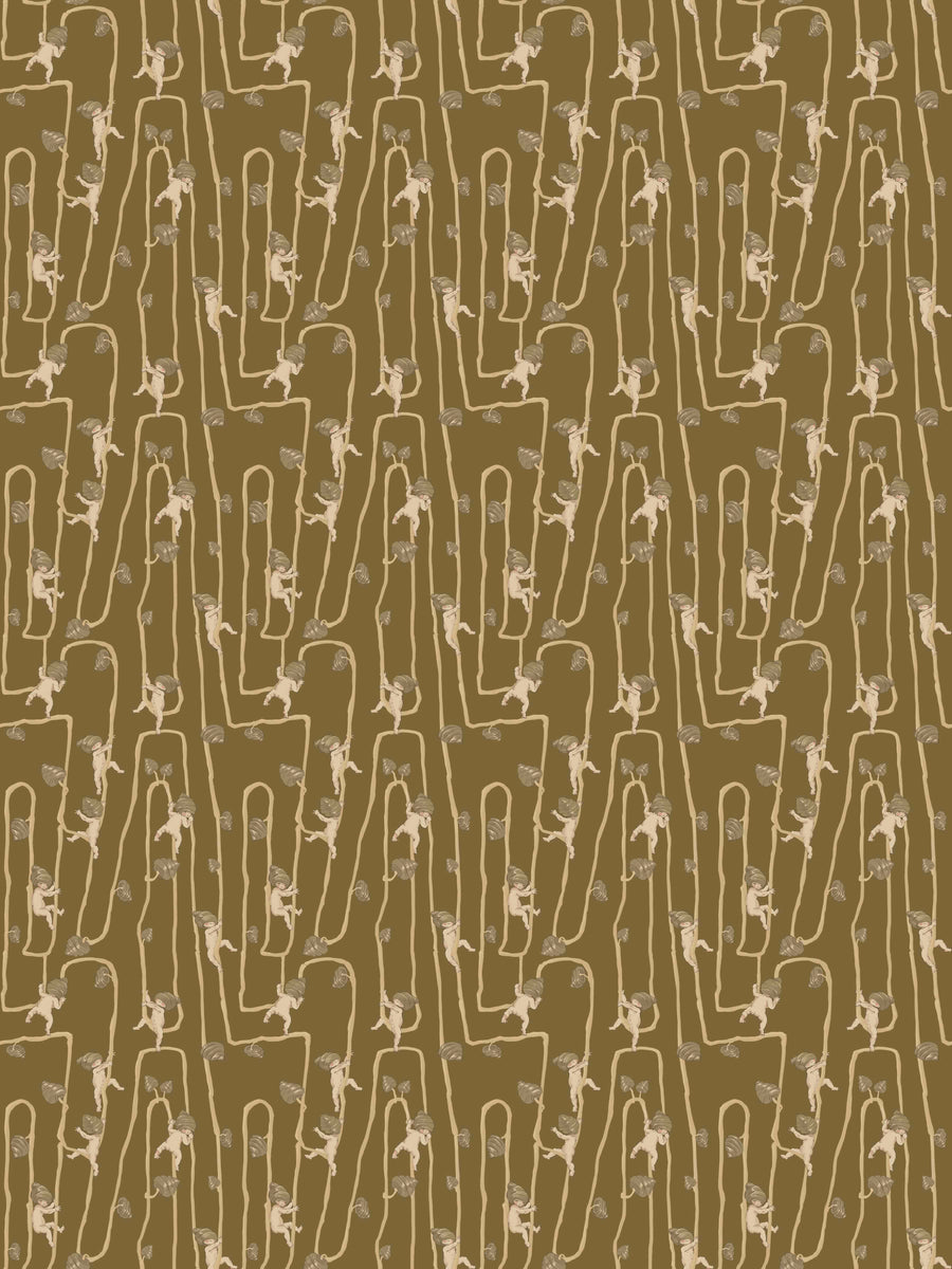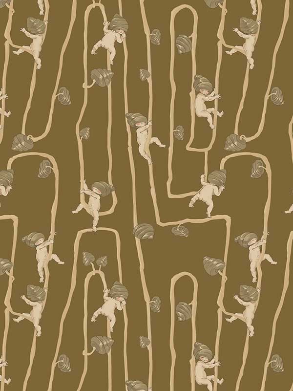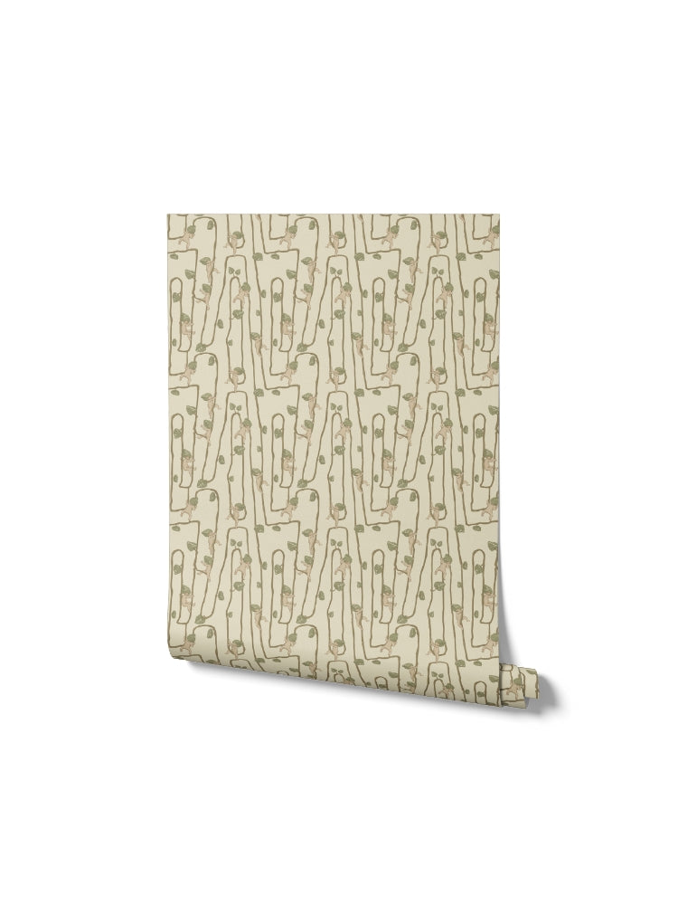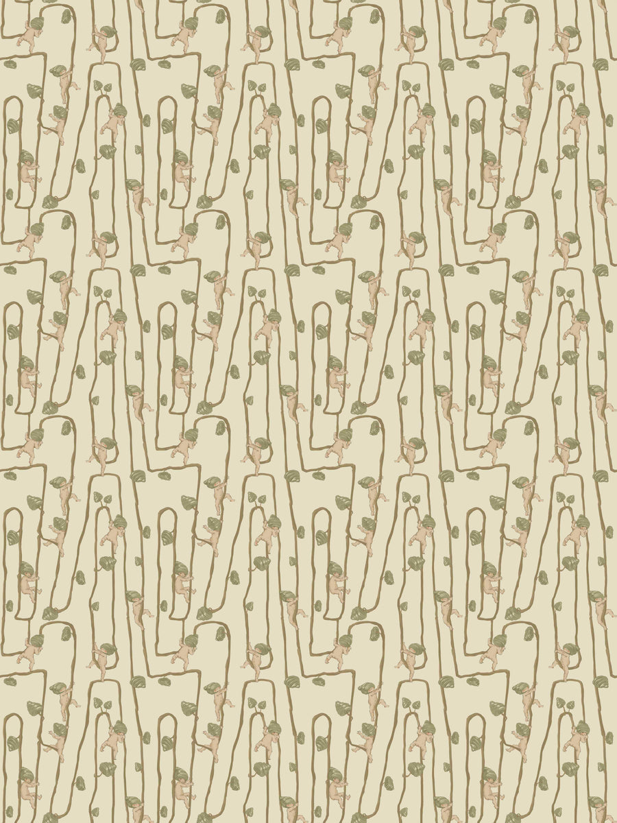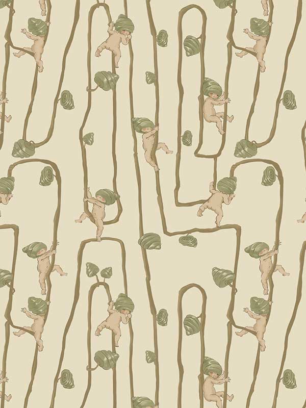 Giggly Bush Babies Wallpaper - Invite a sense of whimsy and nostalgia into your space with this Urban Road X May Gibbs Wallpaper. This exclusive collection design brings May Gibbs’ iconic design style to life, with Gumnut Baby-inspired characters climbing playfully through twisting vines. Available in pumpkin yellow, olive green, pale neutral, sage green, cream neutral, and pale blush pink, this wallpaper creates a delicate balance between nostalgic charm and modern style.