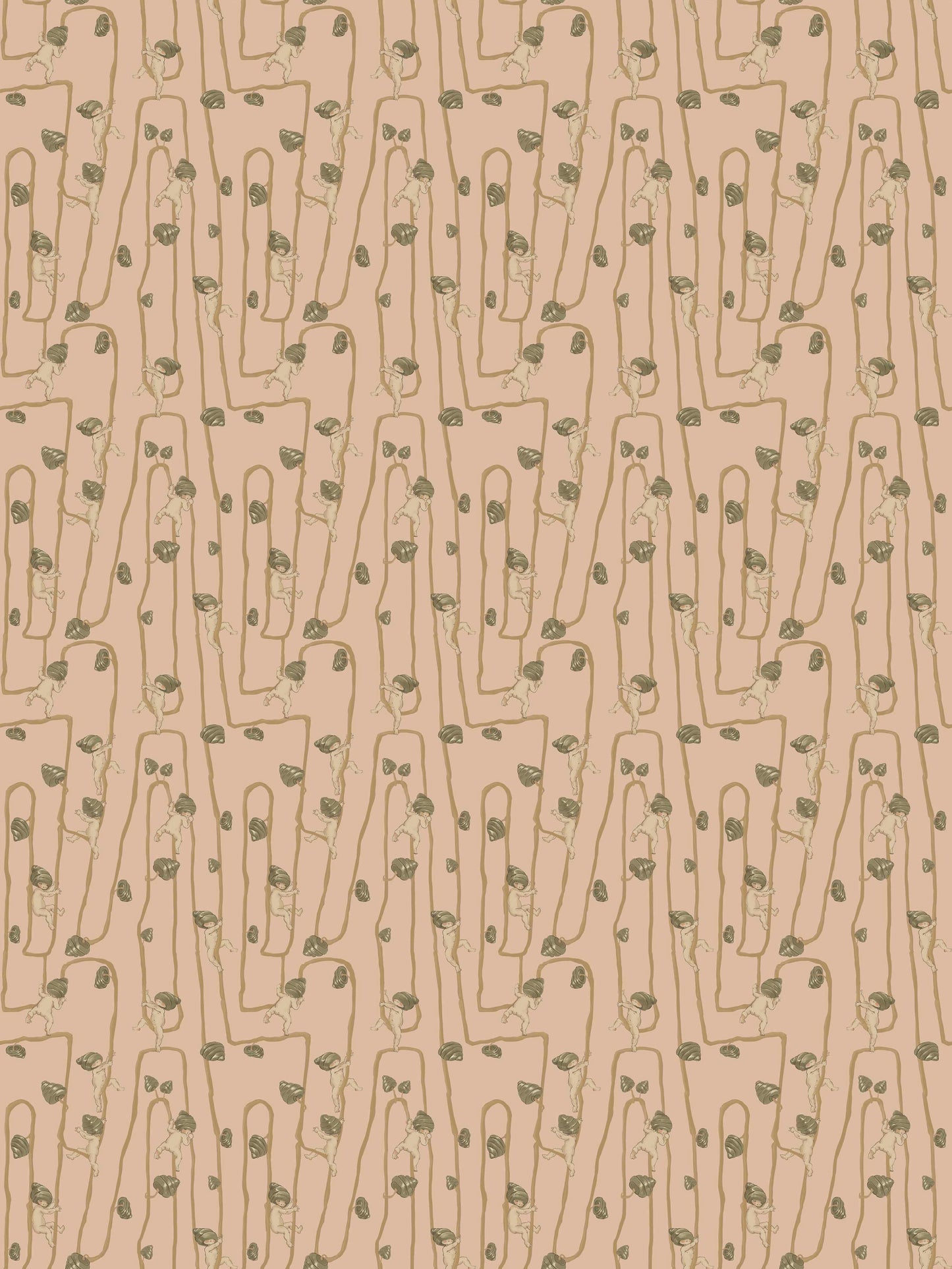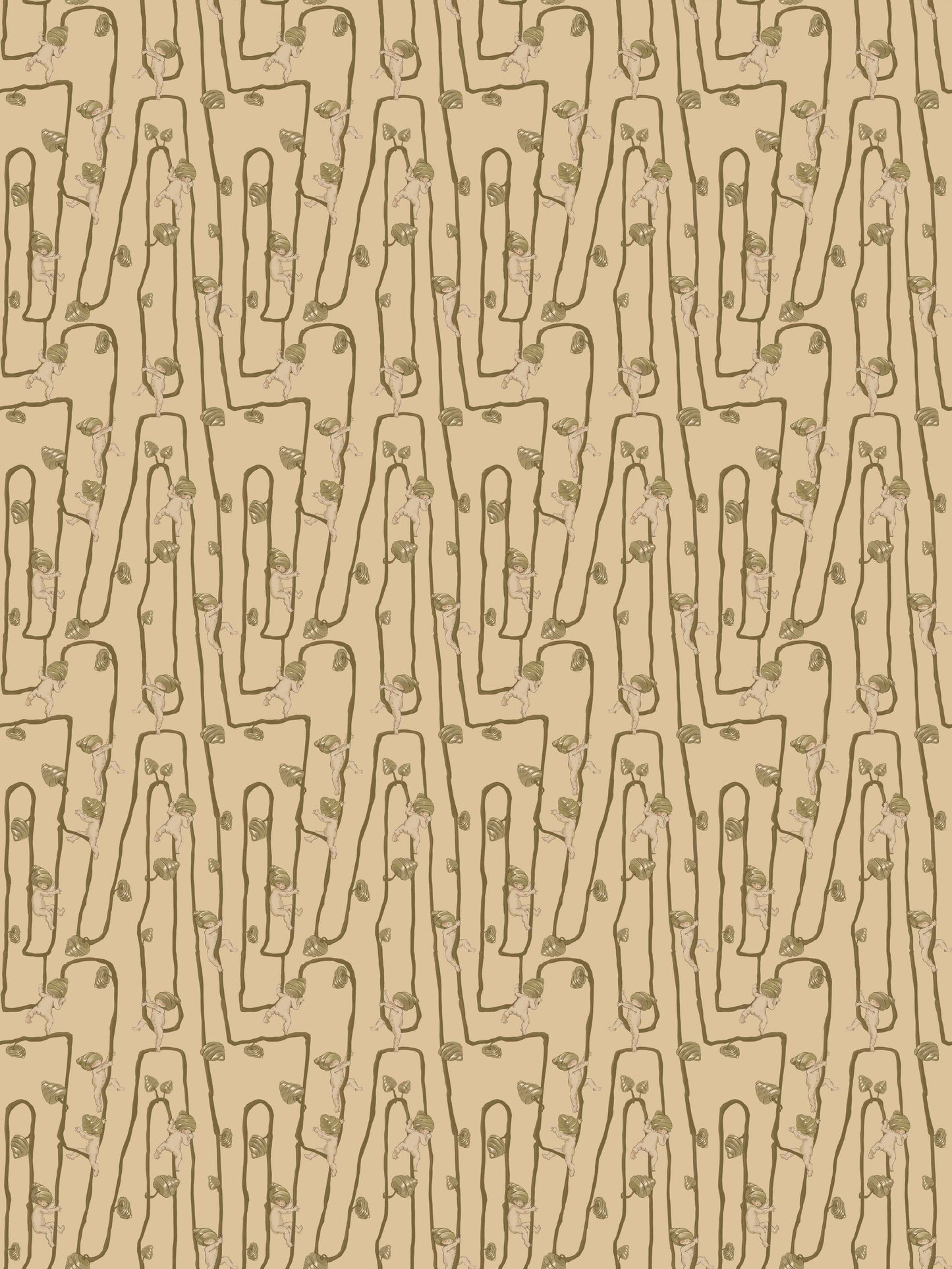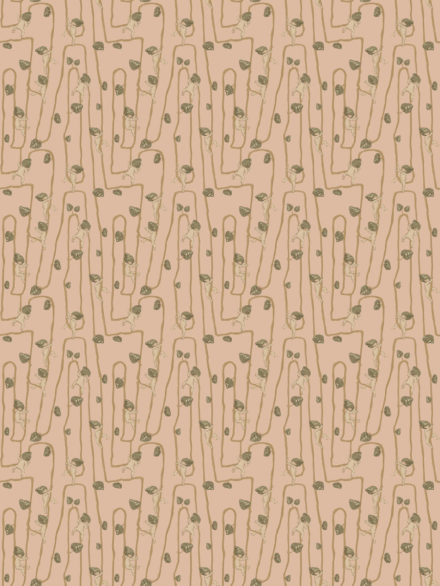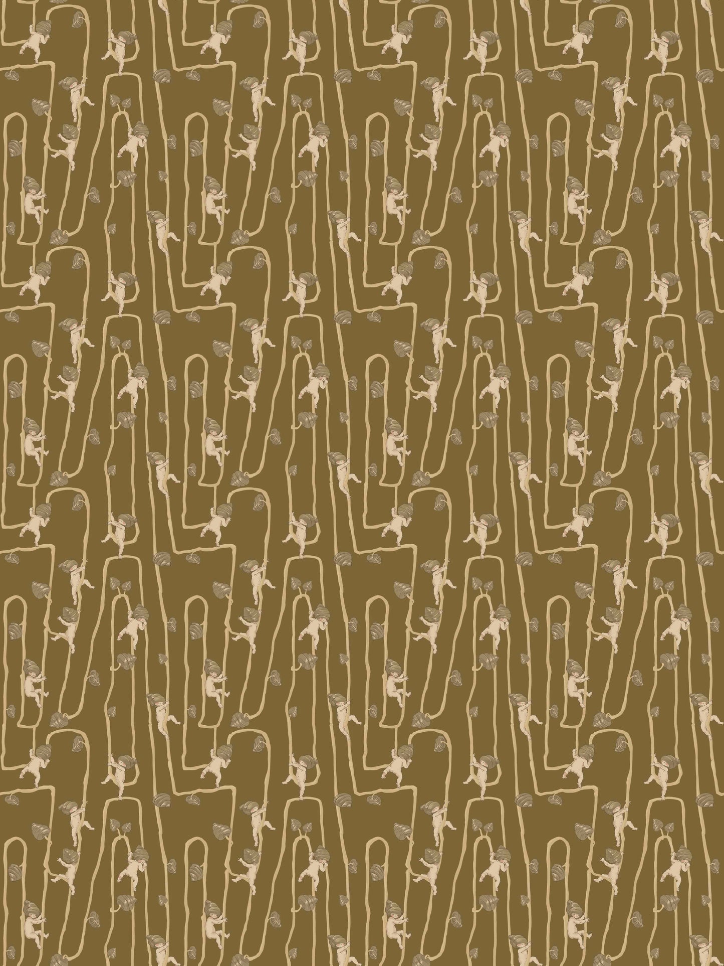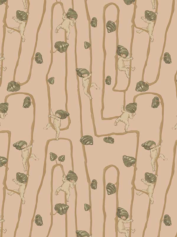 Giggly Bush Babies Wallpaper - Invite a sense of whimsy and nostalgia into your space with this Urban Road X May Gibbs Wallpaper. This exclusive collection design brings May Gibbs’ iconic design style to life, with Gumnut Baby-inspired characters climbing playfully through twisting vines. Available in pumpkin yellow, olive green, pale neutral, sage green, cream neutral, and pale blush pink, this wallpaper creates a delicate balance between nostalgic charm and modern style.