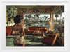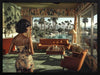 Gilded Memories Framed Art Print - Step into a dream of retro glamour with this stunning photographic artwork. A woman gazes out from a Palm Springs-inspired living room, adorned with mid-century modern furniture, creating a captivating blend of American modern and art deco styles. Rich in warm hues of orange, yellow, and green, this wall art will transform any bedroom or living room into a stylish oasis.