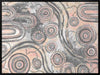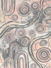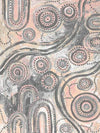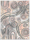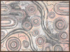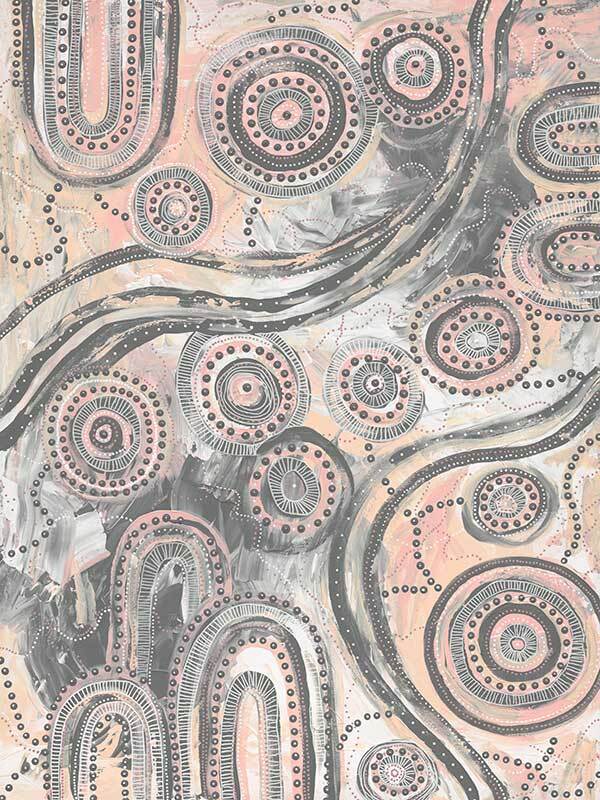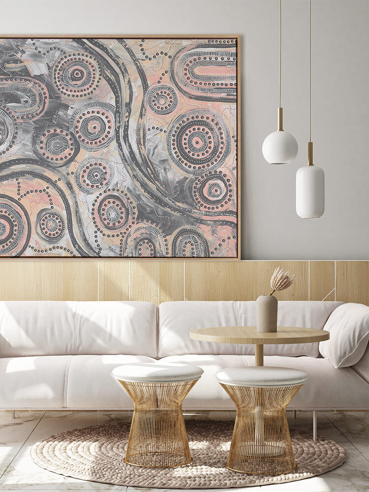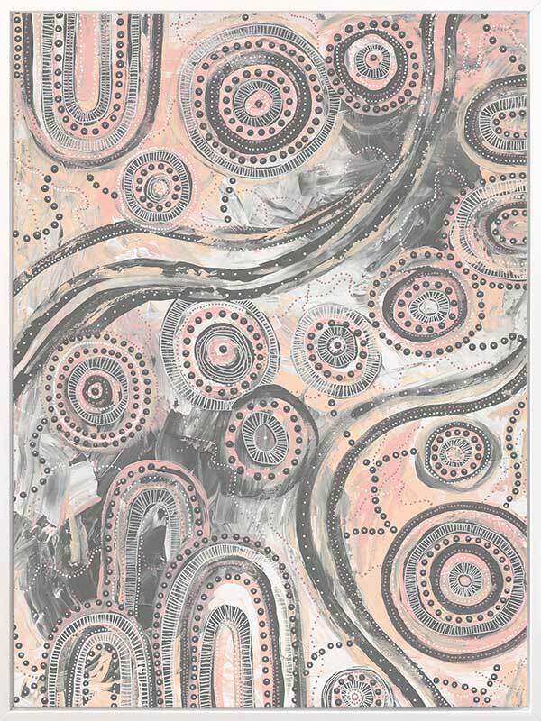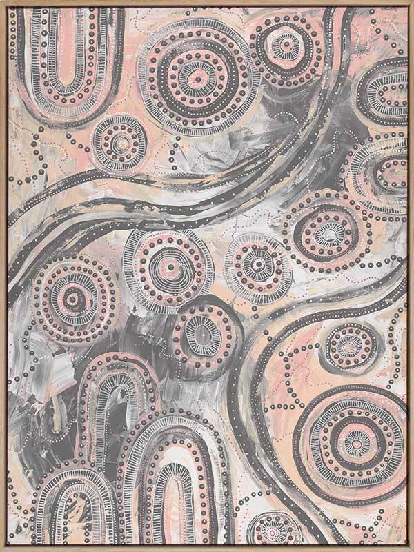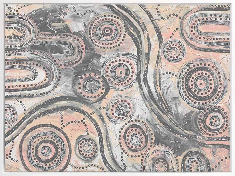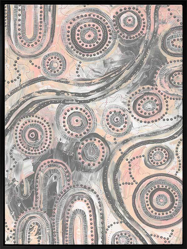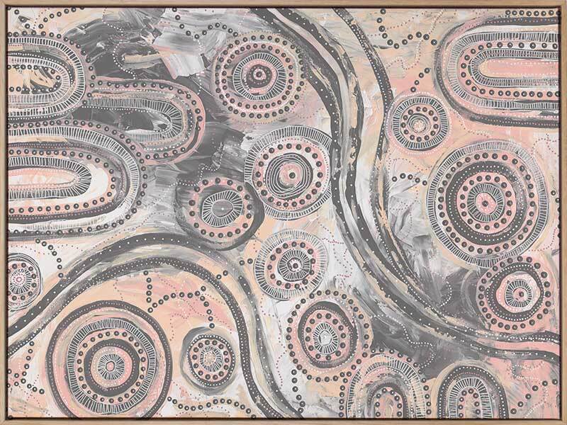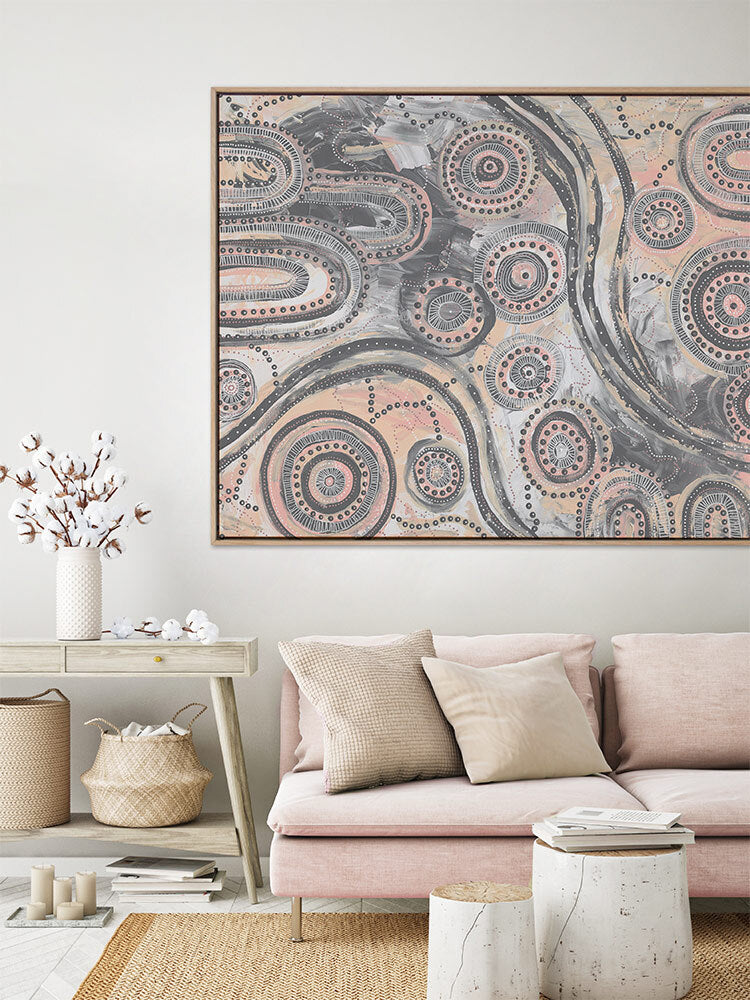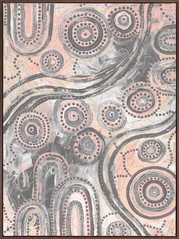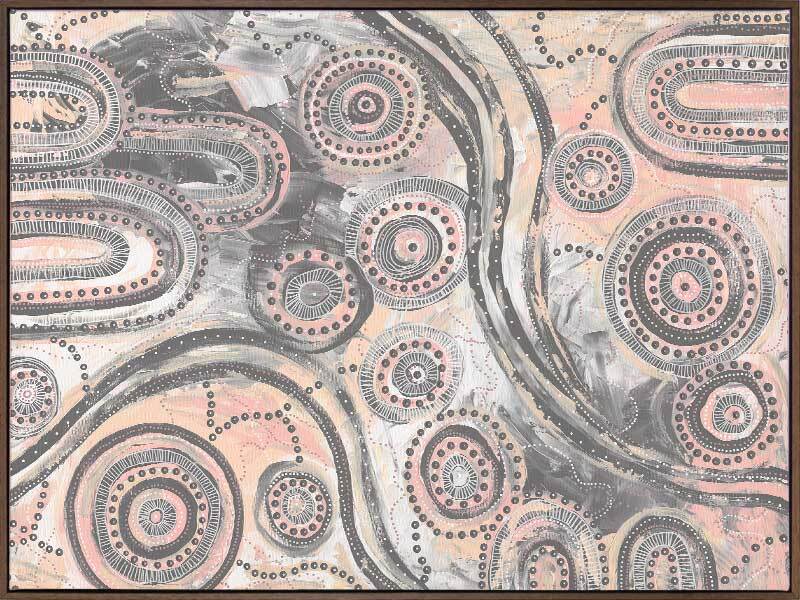 Girra-Warra Canvas Art Print - A contemporary Indigenous Aboriginal artwork that features groupings of concentric circles overlaid and outlined with intricate lines and dots, in a wonderfully considered colour palette of grey and pastel pink and orange.