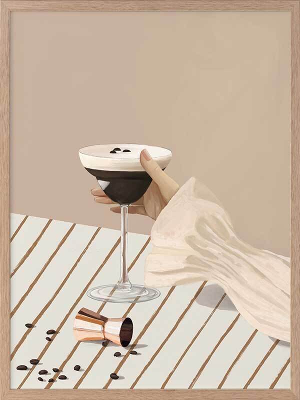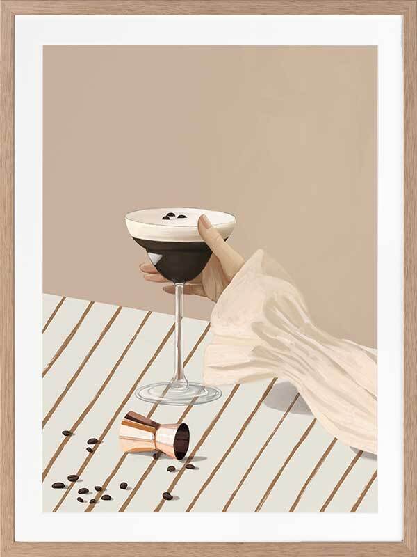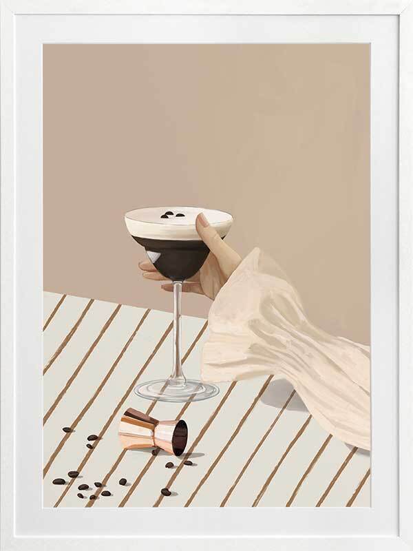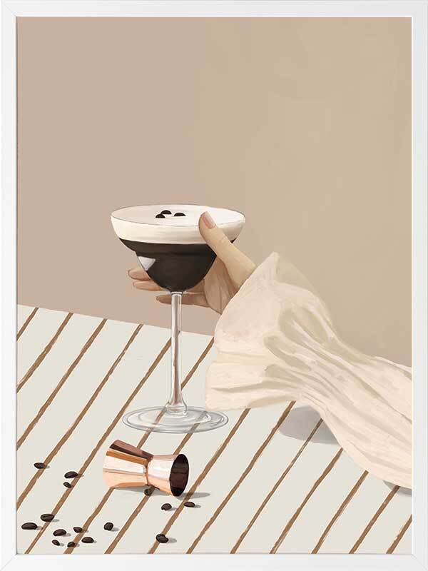 Give Me My Espresso Martini Framed Art Print - Spice up your space with this playful modern art print of the most perfect Espresso Martini, coffee beans and all. A simple palette of soft, light pink, brown, and beige shades make this a versatile artwork for any interior style, with stripes and a plain backdrop that bring a calm, romantic feel that easily incorporates with any decor.