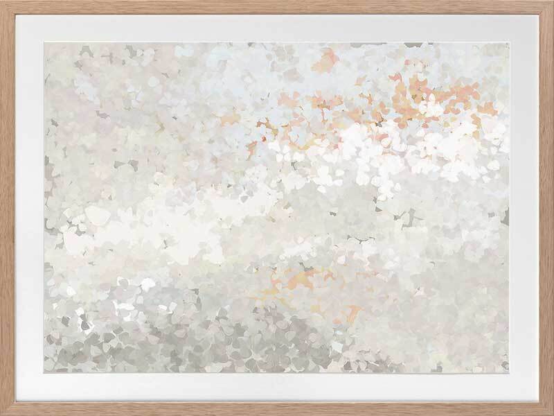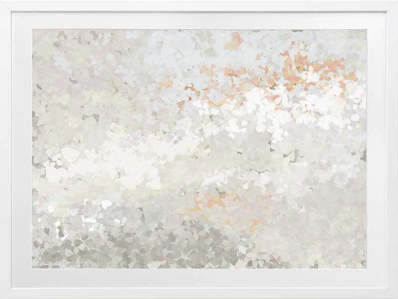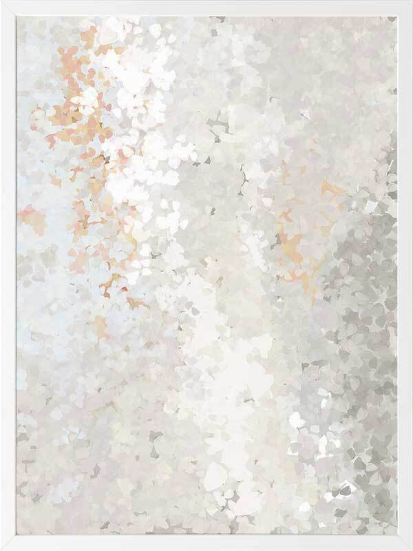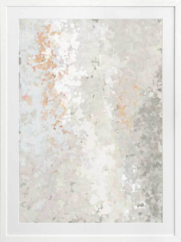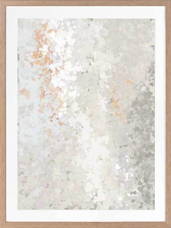 Glitter Glow I Framed Art Print - Like wading through a cloud of glitter, each piece falling gently through the air, this abstract artwork is the perfect way to make a statement if you prefer neutral, subdued colours. Palette includes light and dark grey tones, with hints of orange, light blue, and lilac.
