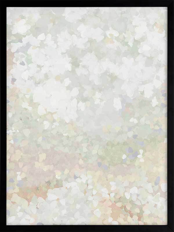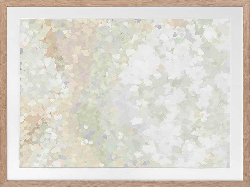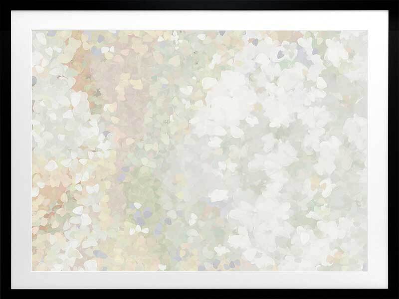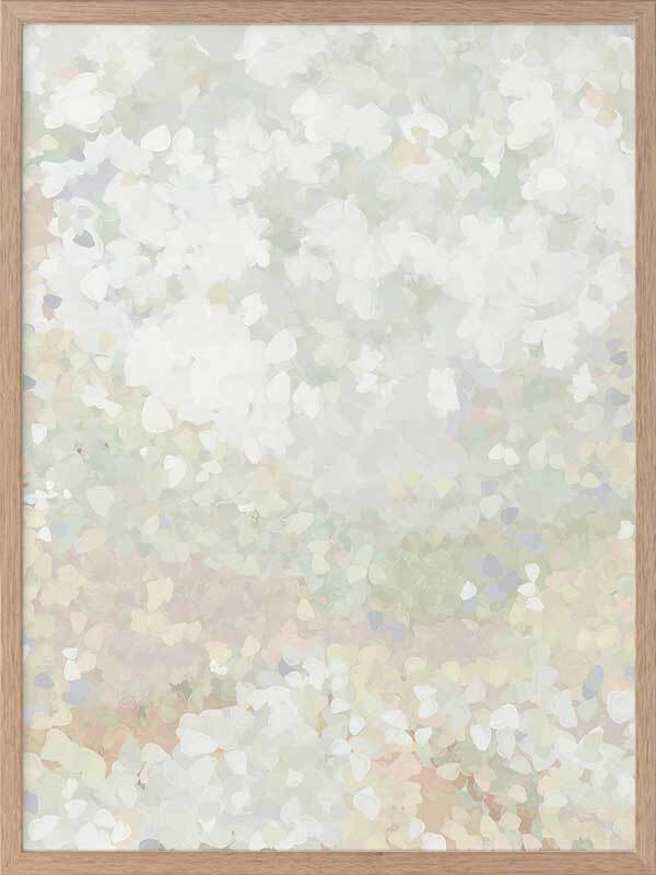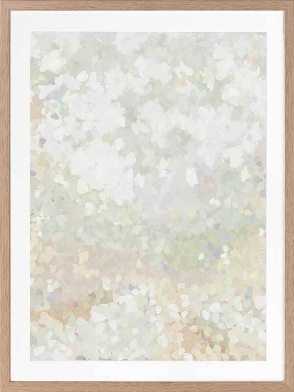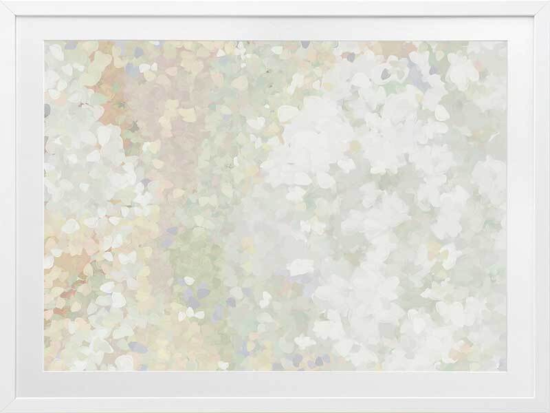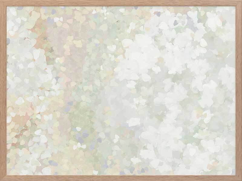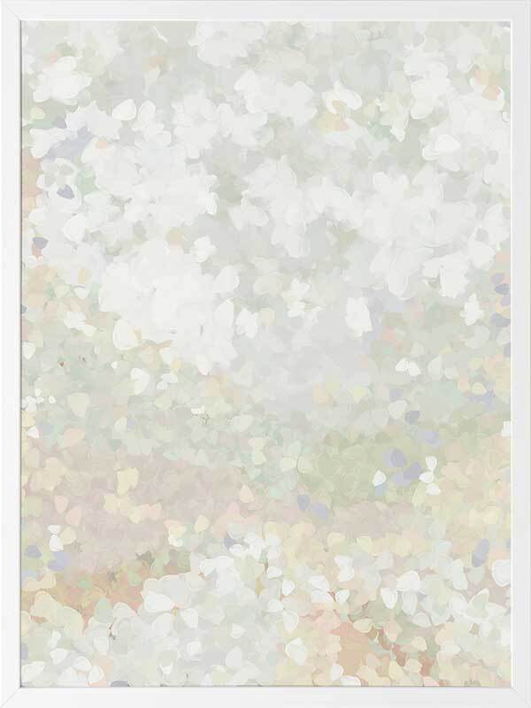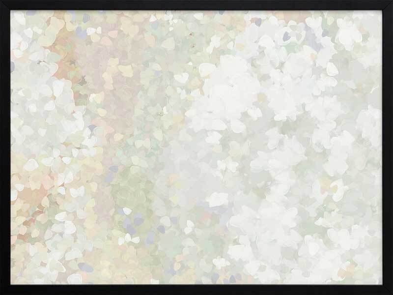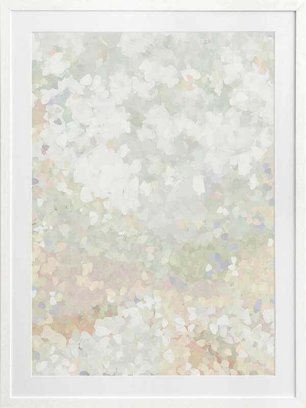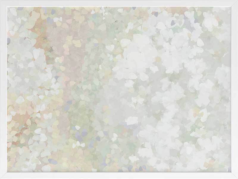 Glitter Glow II Framed Art Print - Like wading through a cloud of glitter, each piece falling gently through the air, this abstract artwork is the perfect way to make a statement if you prefer neutral, subdued colours. Palette includes light green tones, off-white, and hints of lilac.