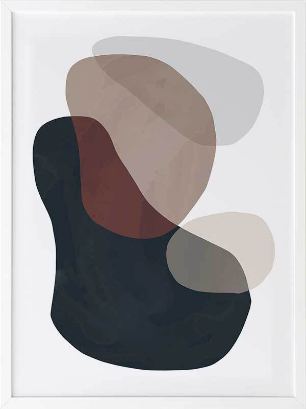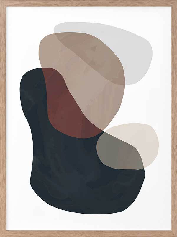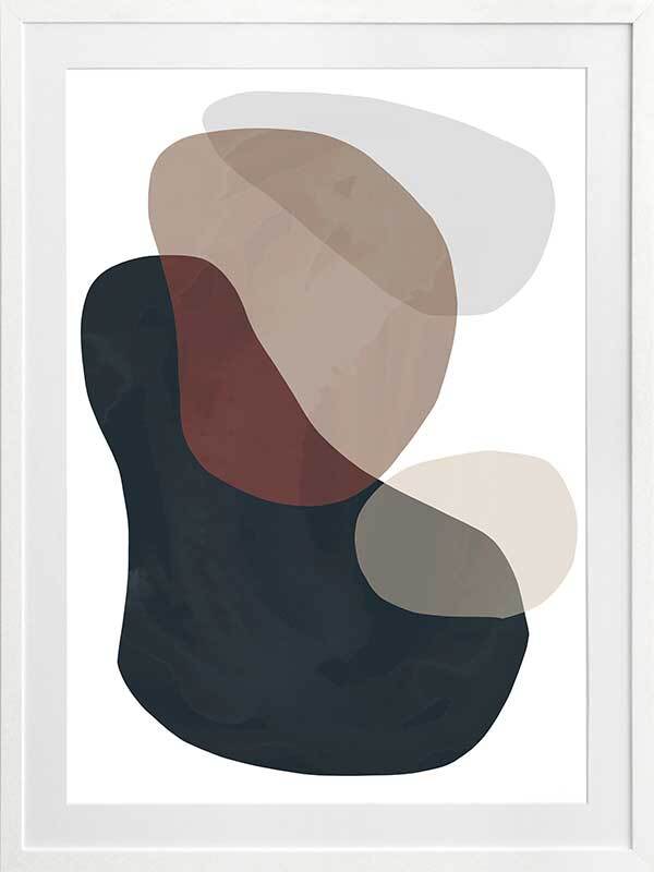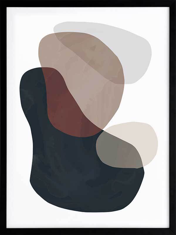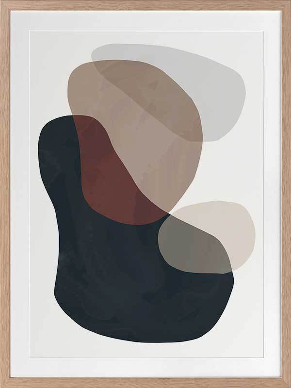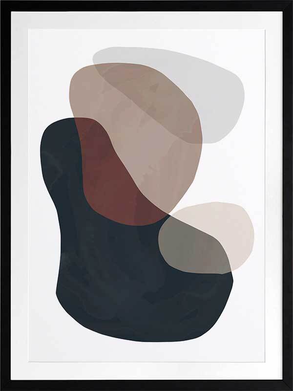 Gloop Framed Art Print - An abstract artwork can really tie a room together, and this piece is no exception. Bold, abstract shapes in onyx black, brown and grey tones float in front of a white contrasting background in this strong and dominant art piece.