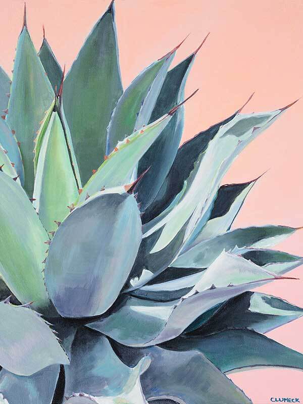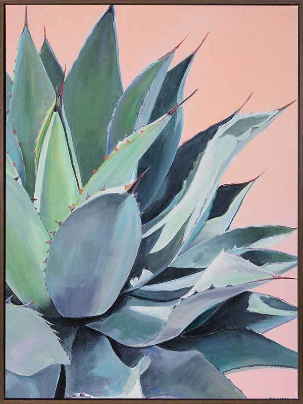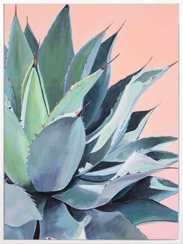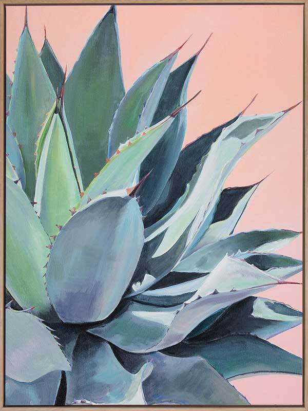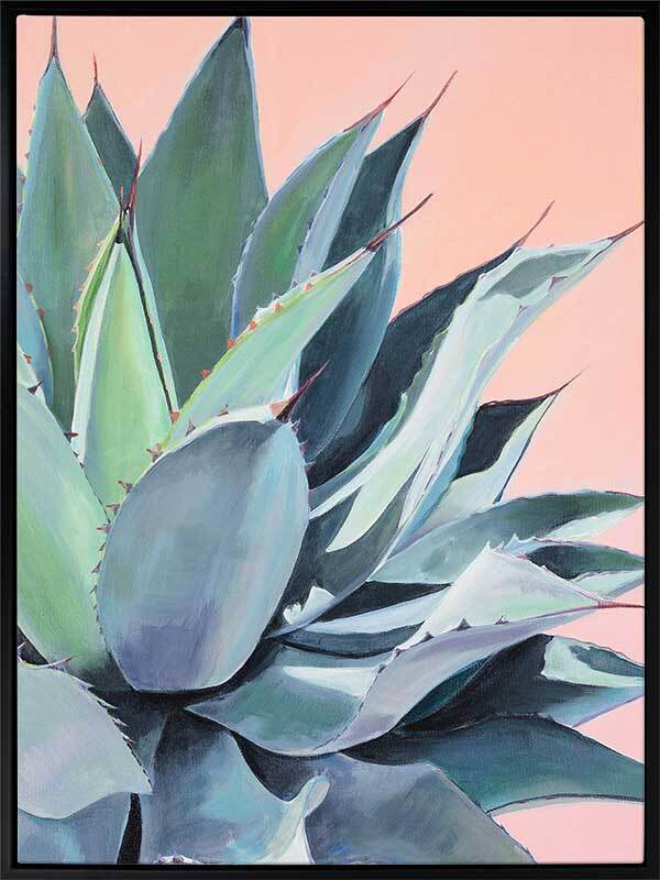 Glory Canvas Art Print - Get up close and personal with this beautiful spiky cactus plant, with realistic shading and detail work. With blue-green tones against a soft, muted pink backdrop, this piece makes a statement in any neutral space.