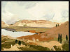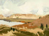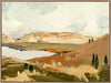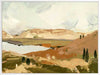 Glory Days Canvas Art Print - The warm, orange sunlight hits the mountain peaks just-so. A calming piece representing wild hilltops, a lake, and the cloudy sky, this artwork is perfect for bringing a sense of calm to any space, with warm beige and brown tones, blended with deep khaki green, and softened blue.